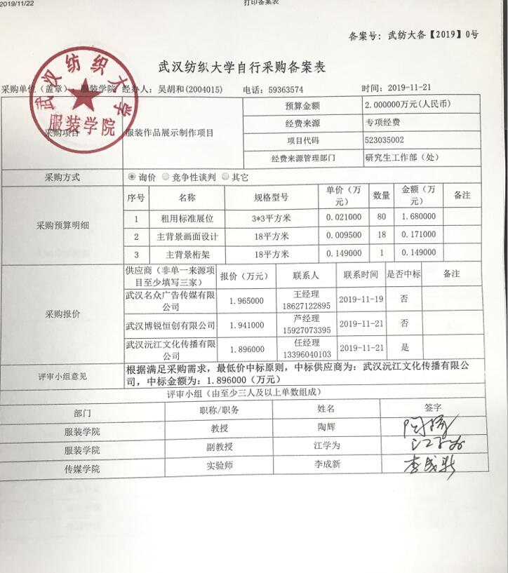 武汉纺织大学自行采购备案表公示