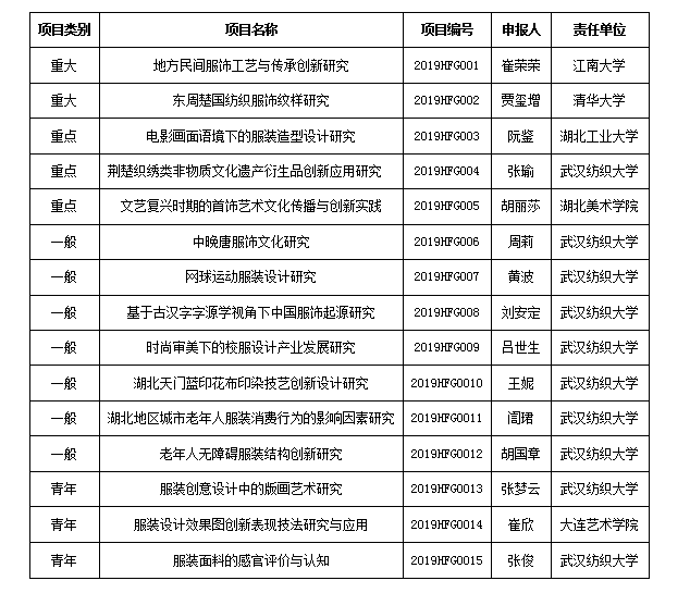 湖北省服饰艺术与文化研究中心2019年度项目已完成专家评审工作,其中《地方民间服饰工艺与传承创新研究》等15项通过评审。各项目负责人应按照《2019年度湖北省普通高等学校人文社会科学重点研究基地“湖北省服饰艺术与文化研究中心”基金项目申报说明》的有关规定,完成相关研究工作。所取得成果均需标注“湖北省服饰艺术与文化研究中心2019年度课题资助项目”字样,方可作为结题验收成果。