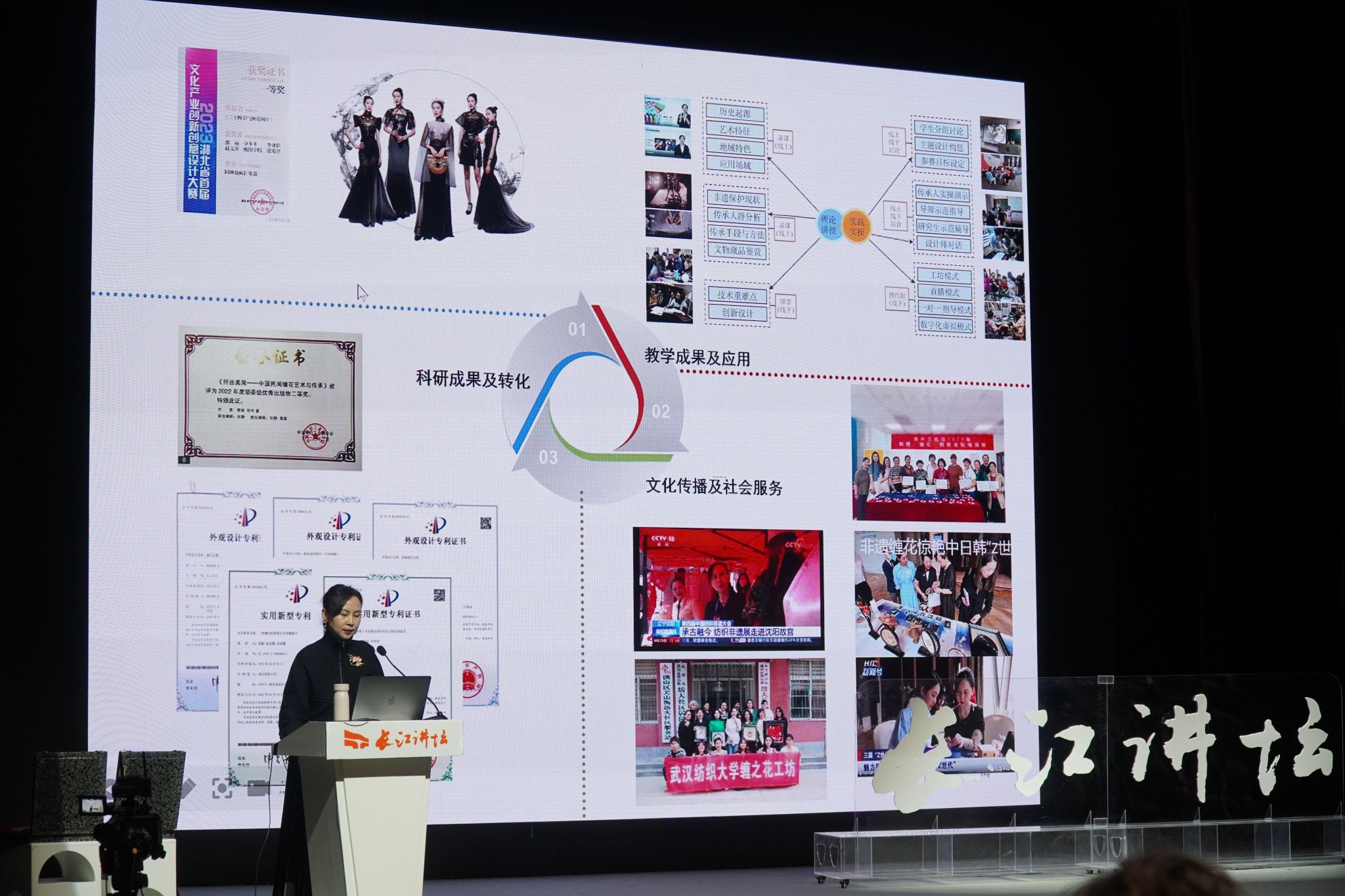讲座伊始,郭丽教授分享团队对湖北、福建和台湾缠花艺术的研究历程。她提到,缠花作为一种源远流长的民间手工艺,承载地域文化和浪漫主义,古人怀揣对大自然的热爱创造出了缠花,以此作为对自然之美的诠释和美好寓意的寄托。团队自从事缠花艺术的研究以来已有十余年,她们用脚步丈量文化,辛劳躬耕田野,拜访湖北、福建和台湾等地区的缠花传承人,通过大量的实地考察和文献梳理,探寻缠花的本源文化,续写缠花的历史发展,攻克技艺难点,助力保护与传承工作,也为缠花艺术在新时代的发展注入了新活力。