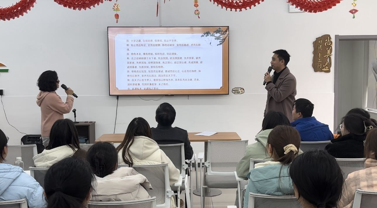 学子及社区工作人员齐声诵读儒家经典《大学》第一章。朗朗诵读声回荡现场,以传统韵律传递修身齐家之道,激发青年学子对国学精髓的感悟与思考。