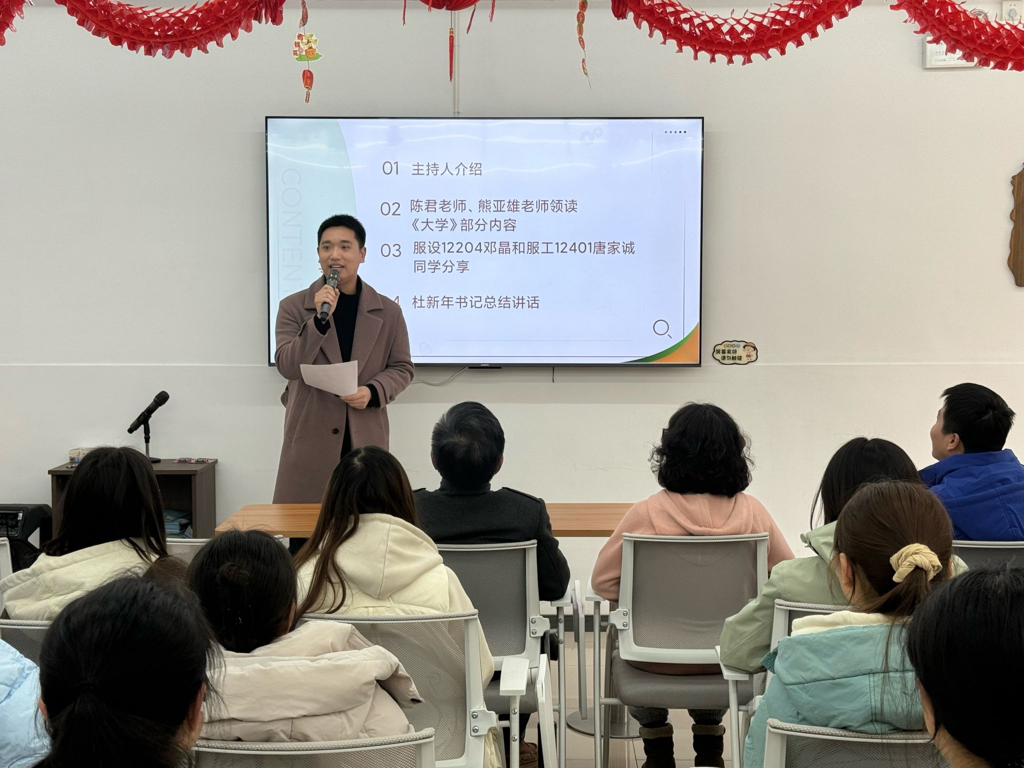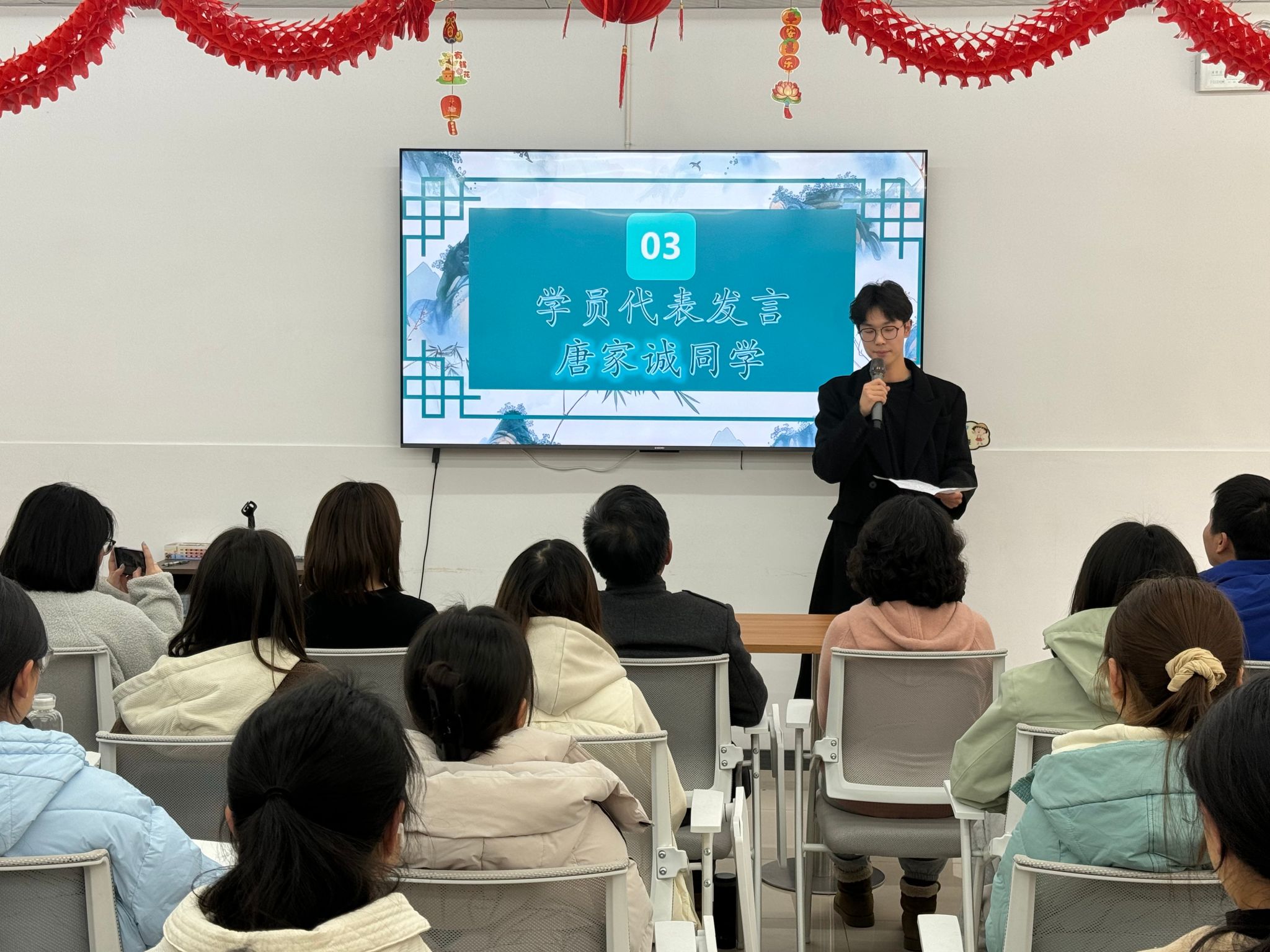 紧接着,唐家诚分享了他在寒假期间深入学习《大学》的收获,他表示,通过寒假期间的《大学》诵读学习,让他对“修身”有了更深的理解,《大学》中强调的‘修身’不仅是个人品德的修养,更是对自我要求的不断提升,只有不断提升自己的专业素养和道德修养,才能在未来的职业生涯中走得更远,”他鼓励同学们在学习专业知识的同时,多读经典,从传统文化中汲取智慧,提升自己的综合素质。