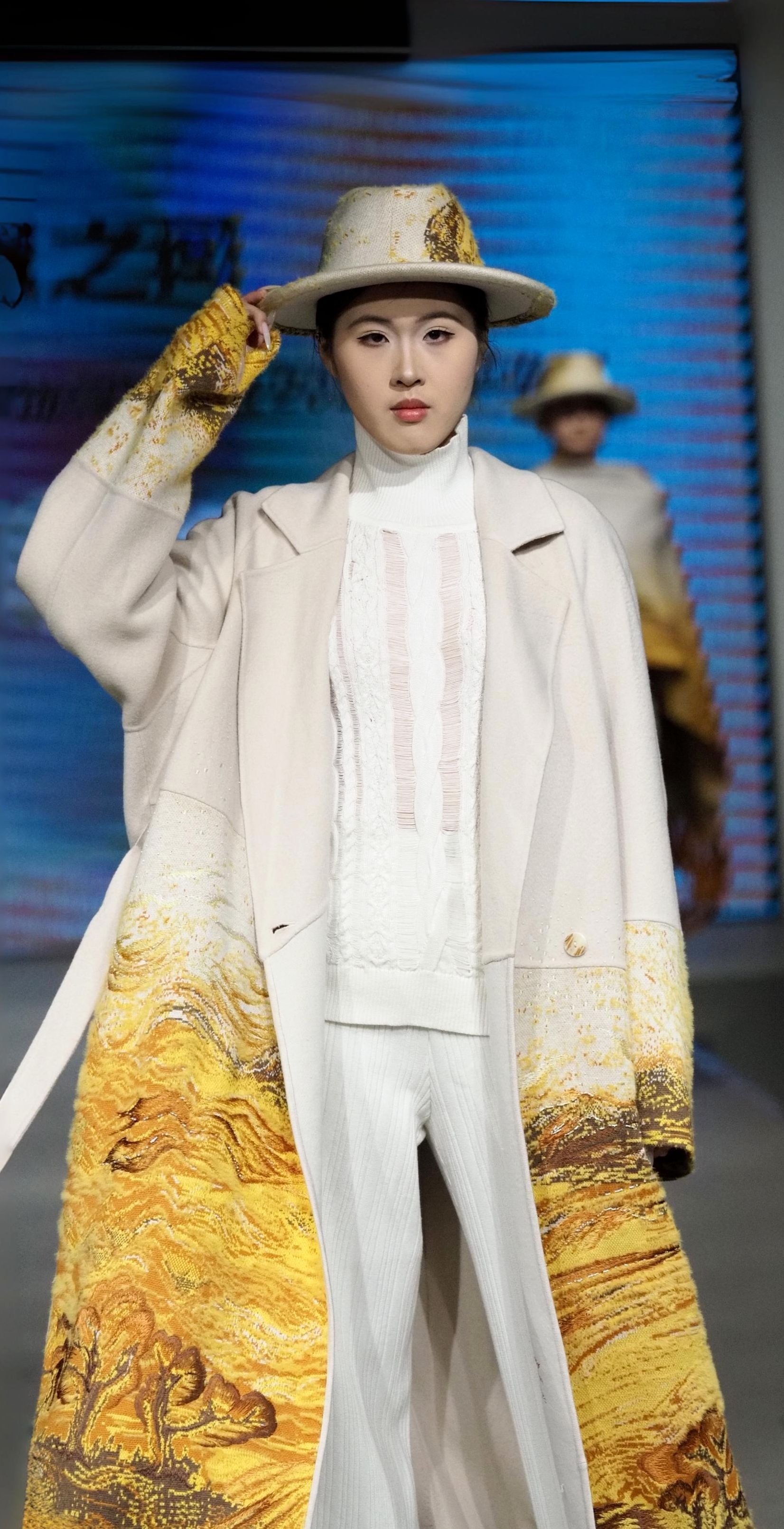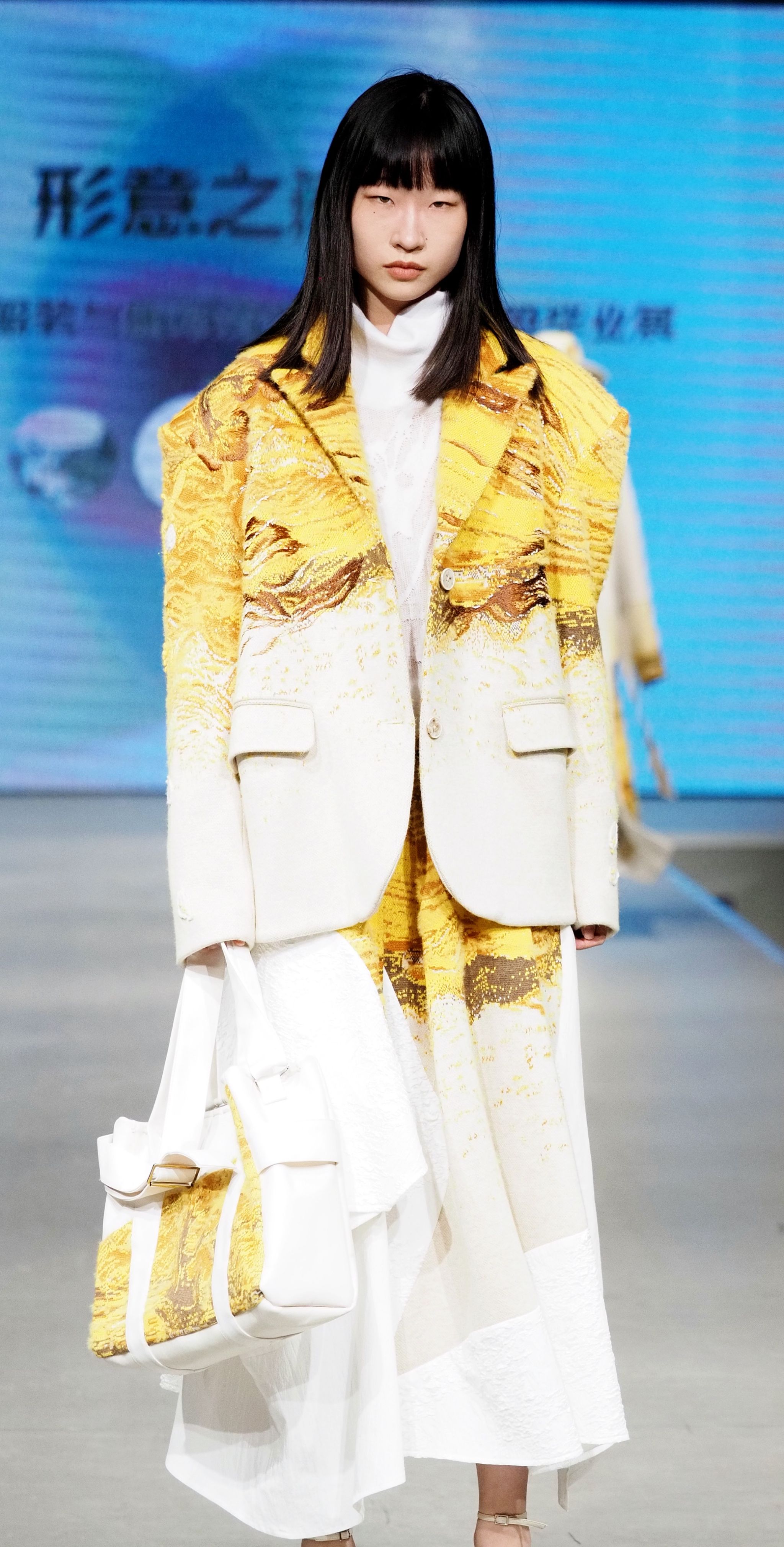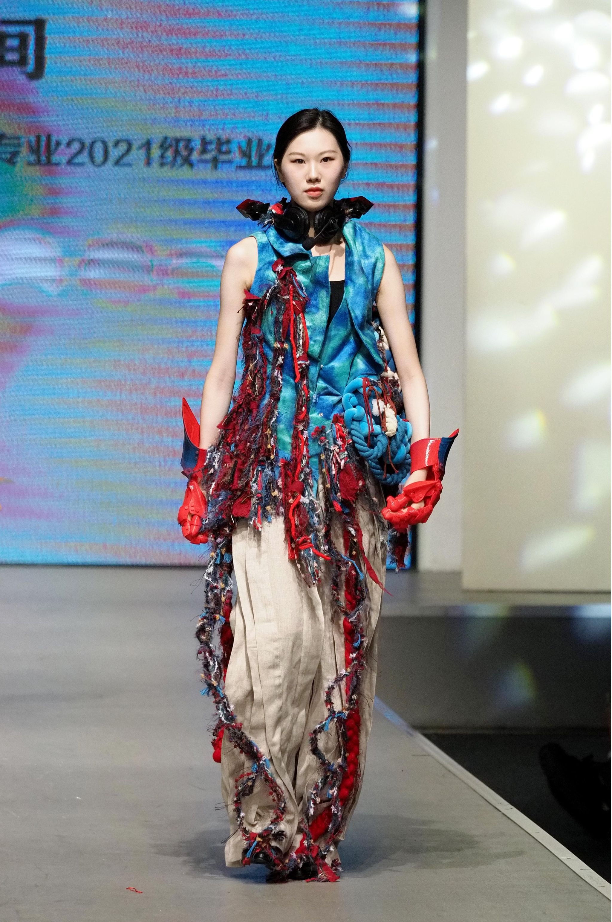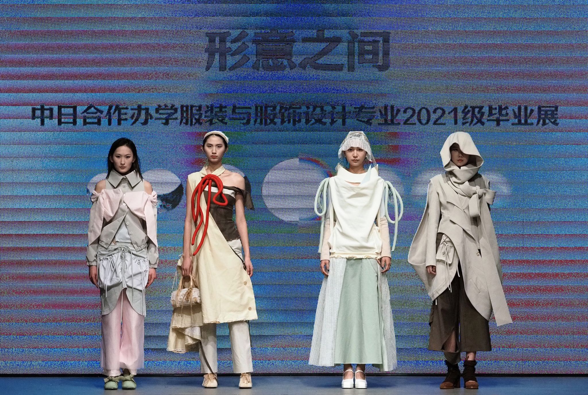 秀场上,视频与T台服装形成“虚实共生”的联动——服设(中外)服设(中外)12103班王钰晴《petite girl》让服装摆脱尺寸的物理桎梏,转而成为精神尺度的丈量者;12101班龚卿《女书》系列的创意解构,得到了极具特色的廓形和穿插结构,仿佛古老符号在行走间被重新编码,体现出传统女性与现代女性的跨时空对话;当模特身披服设(中外)12101班王杰蕊《月相》系列登场时,服装的弧形剪影与月相变幻让人感受到包容的力量和哲思;服设(中外)12102班冯晨婧的《解构》系列,用充气功能性面料编织矛盾美学,将防护本身升华为一场觉醒;服设(中外)12102班何婉婷的《旷野之息》,巧妙将麦田景色移植进入服装,表达出强烈的生命张力,此作品还拿下了2024“润华奖”一带一路大学生时装设计与技能大赛金奖并获得30万元奖金。整个秀场,让AI、3D打印、智能面料等技术不再是冰冷工具,而是与人体共情的创作伙伴。完整的将科技与时尚再造、智造和创造进行了合理编排和融汇。这种“设计—影像—秀场”三位一体的创作模式,不仅突破传统秀场界限,更让观众直观感受到科技如何为时尚注入灵魂。