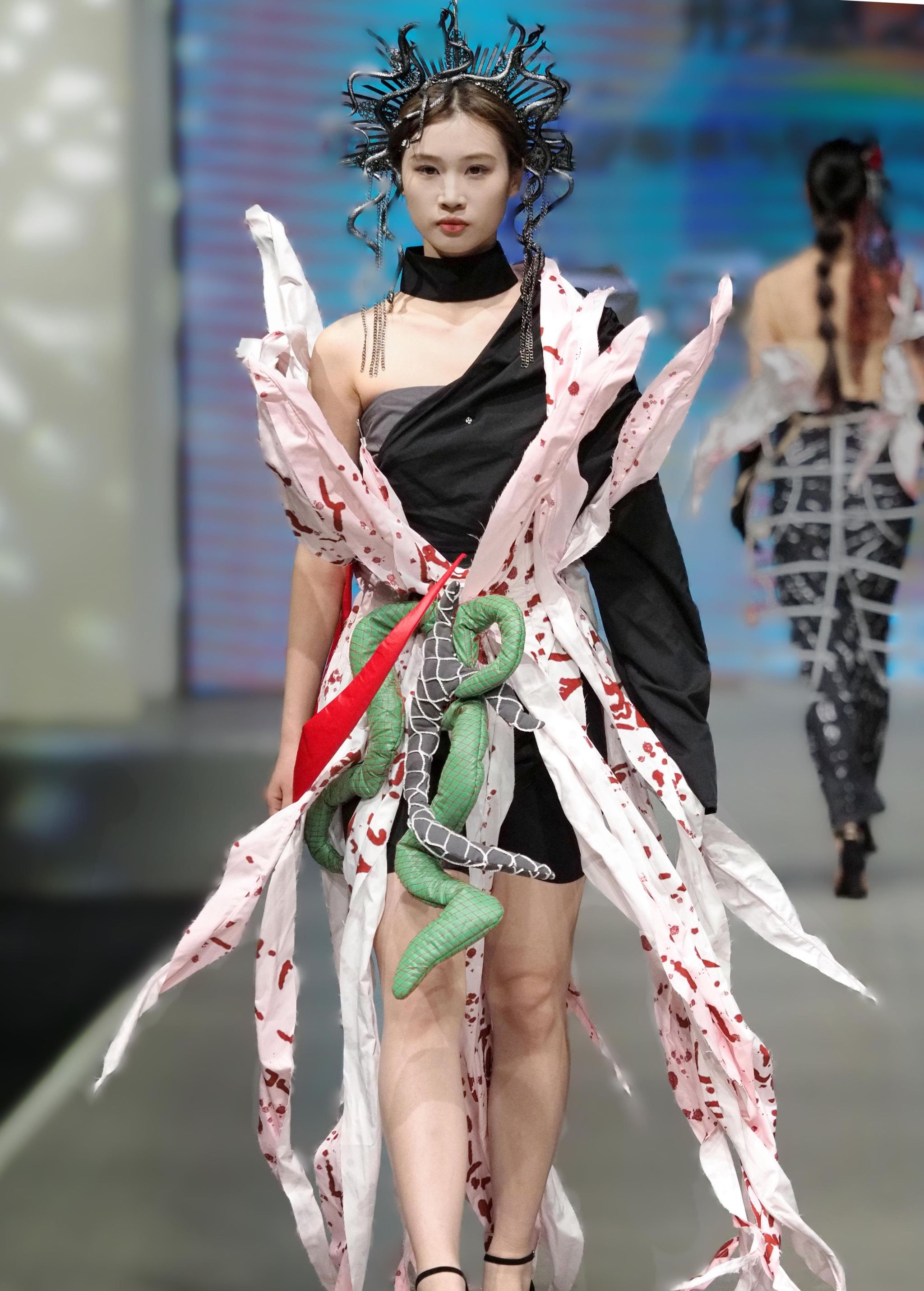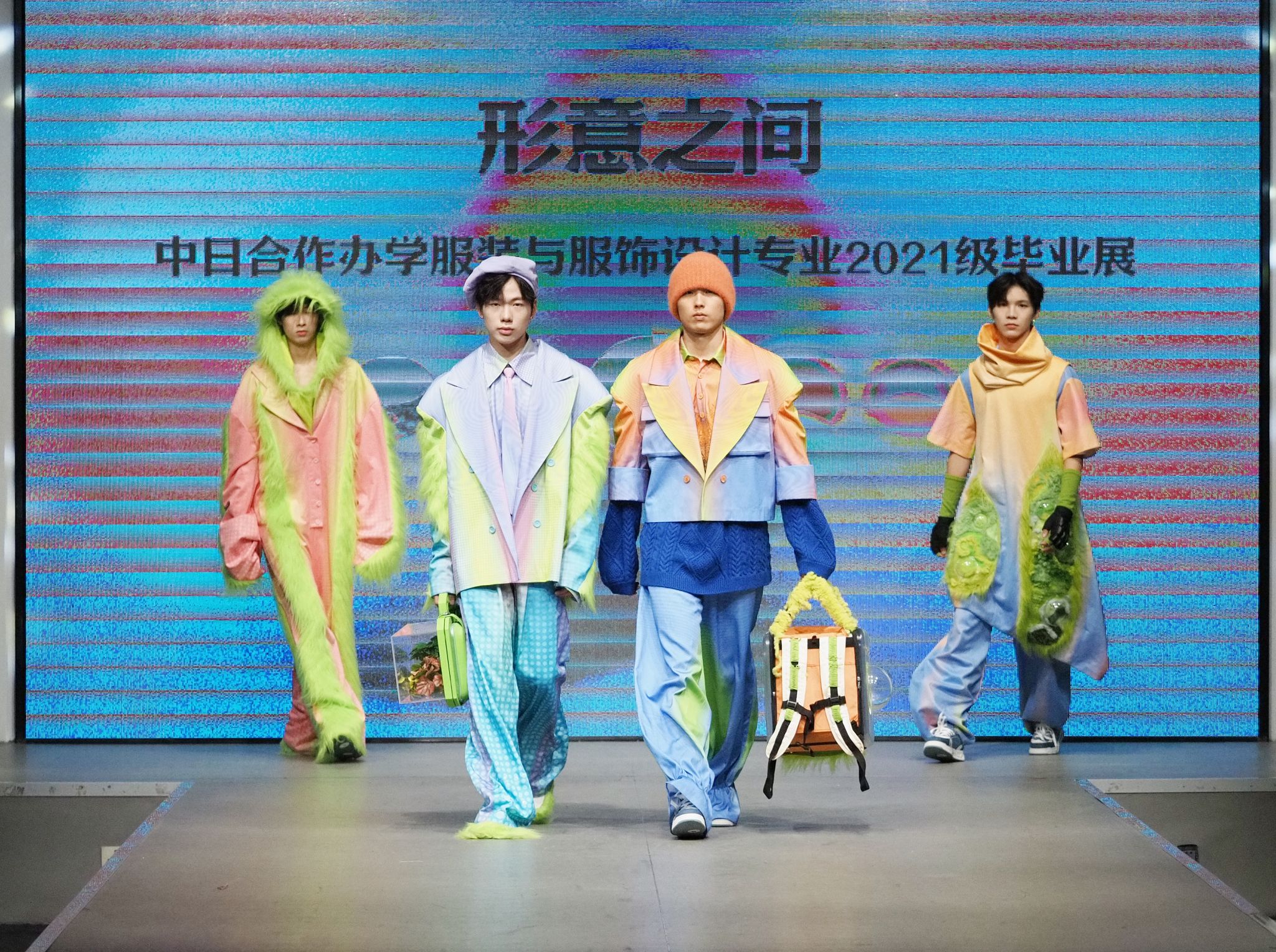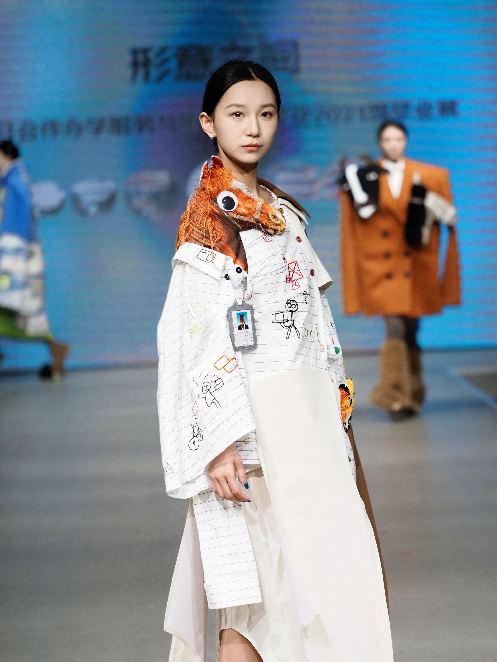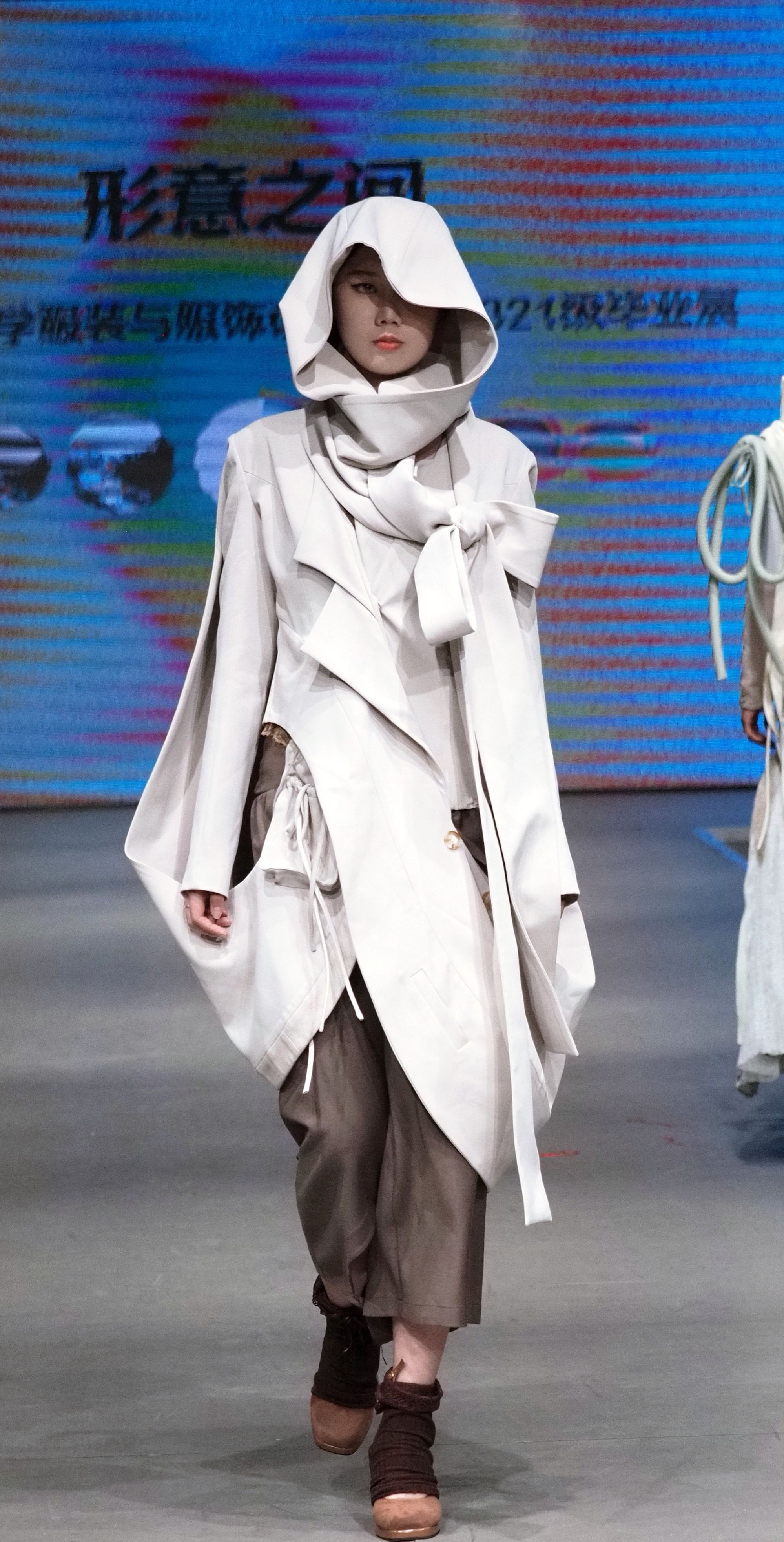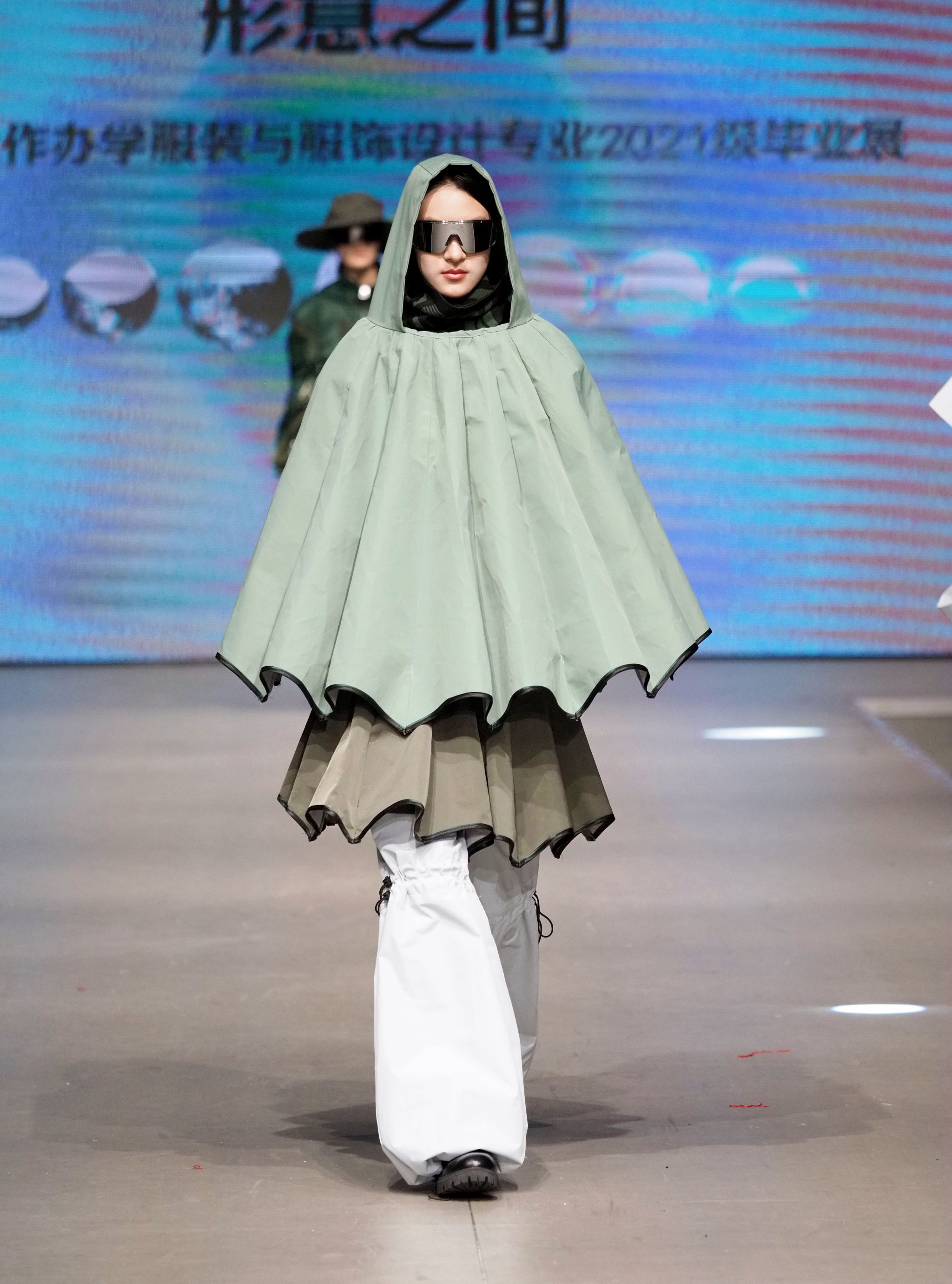秀场上,视频与T台服装形成“虚实共生”的联动——服设(中外)服设(中外)12103班王钰晴《petite girl》让服装摆脱尺寸的物理桎梏,转而成为精神尺度的丈量者;12101班龚卿《女书》系列的创意解构,得到了极具特色的廓形和穿插结构,仿佛古老符号在行走间被重新编码,体现出传统女性与现代女性的跨时空对话;当模特身披服设(中外)12101班王杰蕊《月相》系列登场时,服装的弧形剪影与月相变幻让人感受到包容的力量和哲思;服设(中外)12102班冯晨婧的《解构》系列,用充气功能性面料编织矛盾美学,将防护本身升华为一场觉醒;服设(中外)12102班何婉婷的《旷野之息》,巧妙将麦田景色移植进入服装,表达出强烈的生命张力,此作品还拿下了2024“润华奖”一带一路大学生时装设计与技能大赛金奖并获得30万元奖金。整个秀场,让AI、3D打印、智能面料等技术不再是冰冷工具,而是与人体共情的创作伙伴。完整的将科技与时尚再造、智造和创造进行了合理编排和融汇。这种“设计—影像—秀场”三位一体的创作模式,不仅突破传统秀场界限,更让观众直观感受到科技如何为时尚注入灵魂。
