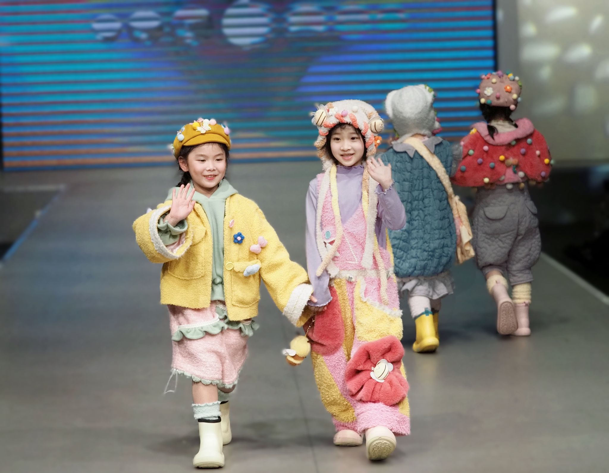 整场首秀包括创意成衣、创意多巴胺、创意机能等篇章,总计 102套服装,其中包括男装18套,女装76套,童装8套。设计师以敬畏之心触碰自然馈赠,亚麻纤维的褶皱里生长出沙漠风蚀的纹路,回收渔网编织的网纱在灯光下泛起海洋的粼光,让古老植物染技法被重新唤醒,靛蓝在丝绸上晕染出雾霭山岚,每一粒纽扣都是对工业边角料的再创作,线迹穿梭间,服装成为循环永续的生态宣言;3D打印的晶格纹理折射出数码时代的虹彩,智能温控面料或充气面料让科技赋形更加具象化,展示一个光影织就的未来图腾;各种创意所采取的立体剪裁和构建的几何语言,让刺绣等传统元素在科技的转换下,进一步推动东方美学的当代转译;模特行走的轨迹本身成为设计语言,压感面料记录步履的轻重缓急,将行走与思考的时尚叙事通过T台缓缓徐来,为接下来的5个秀场,在可持续的未来里,生长成新的美学年轮。
