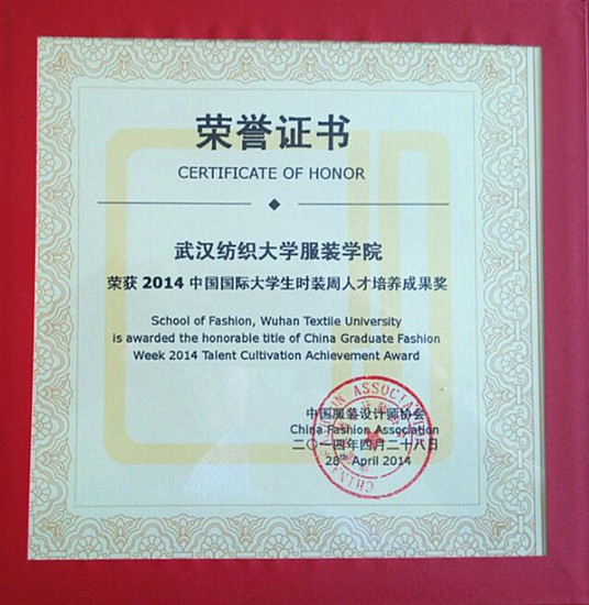 这五项大奖分别为中国国际大学生时装周优秀发布奖、人才培养成果奖;由中国服装设计师协会组织评选产生的2014年度中国时装设计“育人奖”、“优秀指导教师奖”以及第19届中国时装设计“新人奖”。