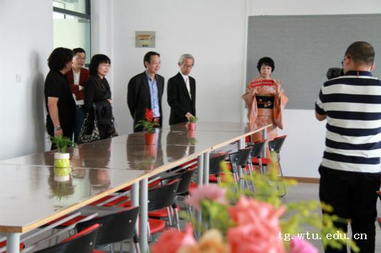 领导陪同下参观了中日班教学设施与实践场所,充分展示了我院在中日合作项目上的优越办学条件及雄厚的师资力量。参观完专业教室和实践场所后,滨田校长和宫本课长还与中日班的学生们进行了一个多小时的面对面交流,他们从今天出席活动的着装谈起,深入浅出地阐述了该校服饰设计的基本理念,并对中日服饰设计的基本异同及世界时尚潮流趋势做了简短介绍,内容之丰富不亚于一场即兴的小型讲座。最后,滨田校长表达了对在座各位同学早日赴日深造的期待,同时他也表示日本文化学園大学对本次中日合作项目十分看重,并将在今后进一步加强与我校的人才交流和国际合作。