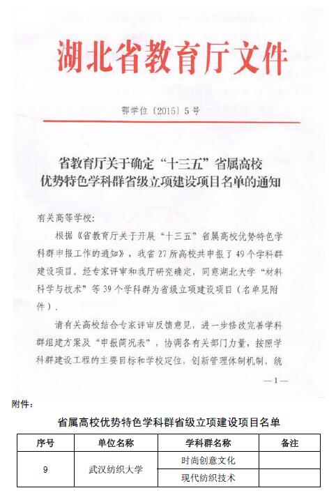 日前,省教育厅公布了《“十三五”省属高校优势特色学科群省级立项建设名单的通知》(鄂学位〔2015〕5号),我院“时尚创意文化”学科群顺利入选。