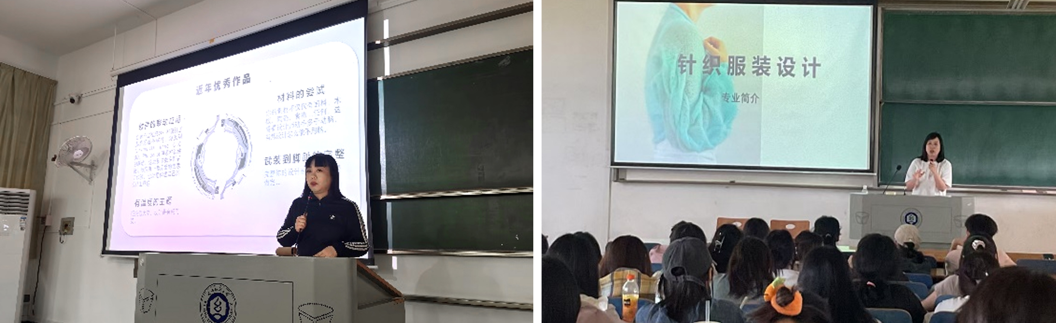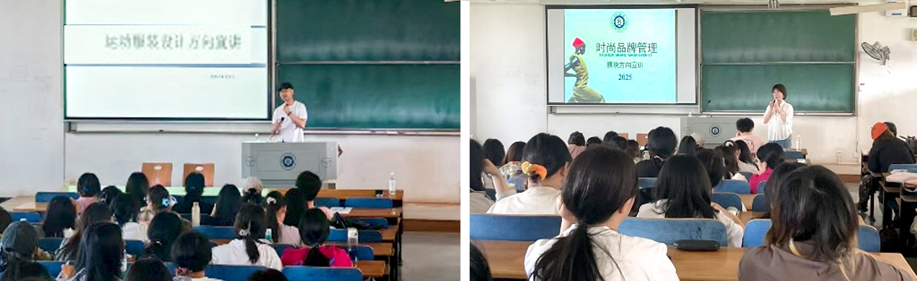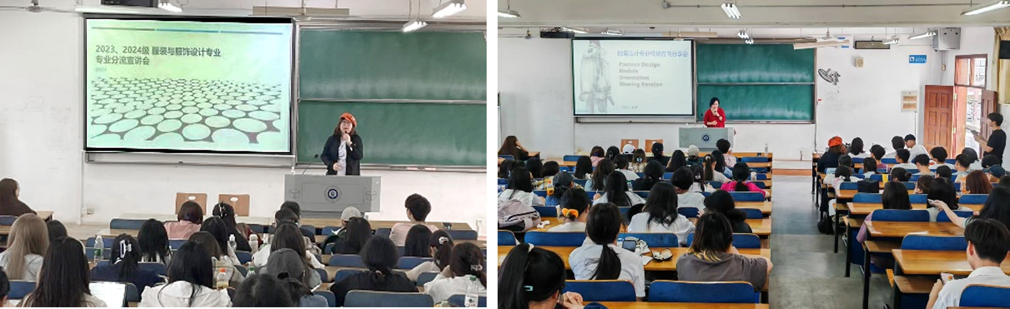 分别在阳光3号教学楼415教室和南湖尚知楼110教室举办了服装与服饰设计专业2023级、2024级模块方向宣讲会。设计一系主任张丹、设计二系主任郭梦娜、余倩老师、乔丹副教授、黄皆明副教授、周奕老师及2023级、2024级全体服装与服饰设计专业本科生全程参加,两场宣讲会分别由系主任张丹及郭梦娜主持。