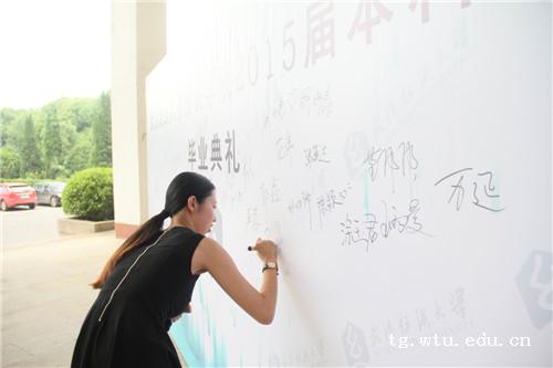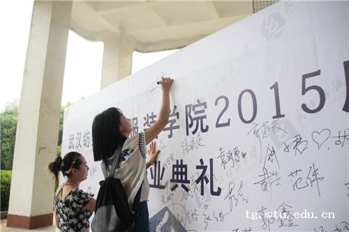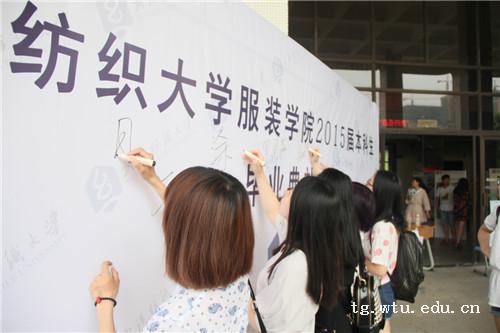 典礼结束后,毕业学子们还在印有毕业典礼的展板上签上自己的大名,向学校宣告四年纺大人,终生纺大人。