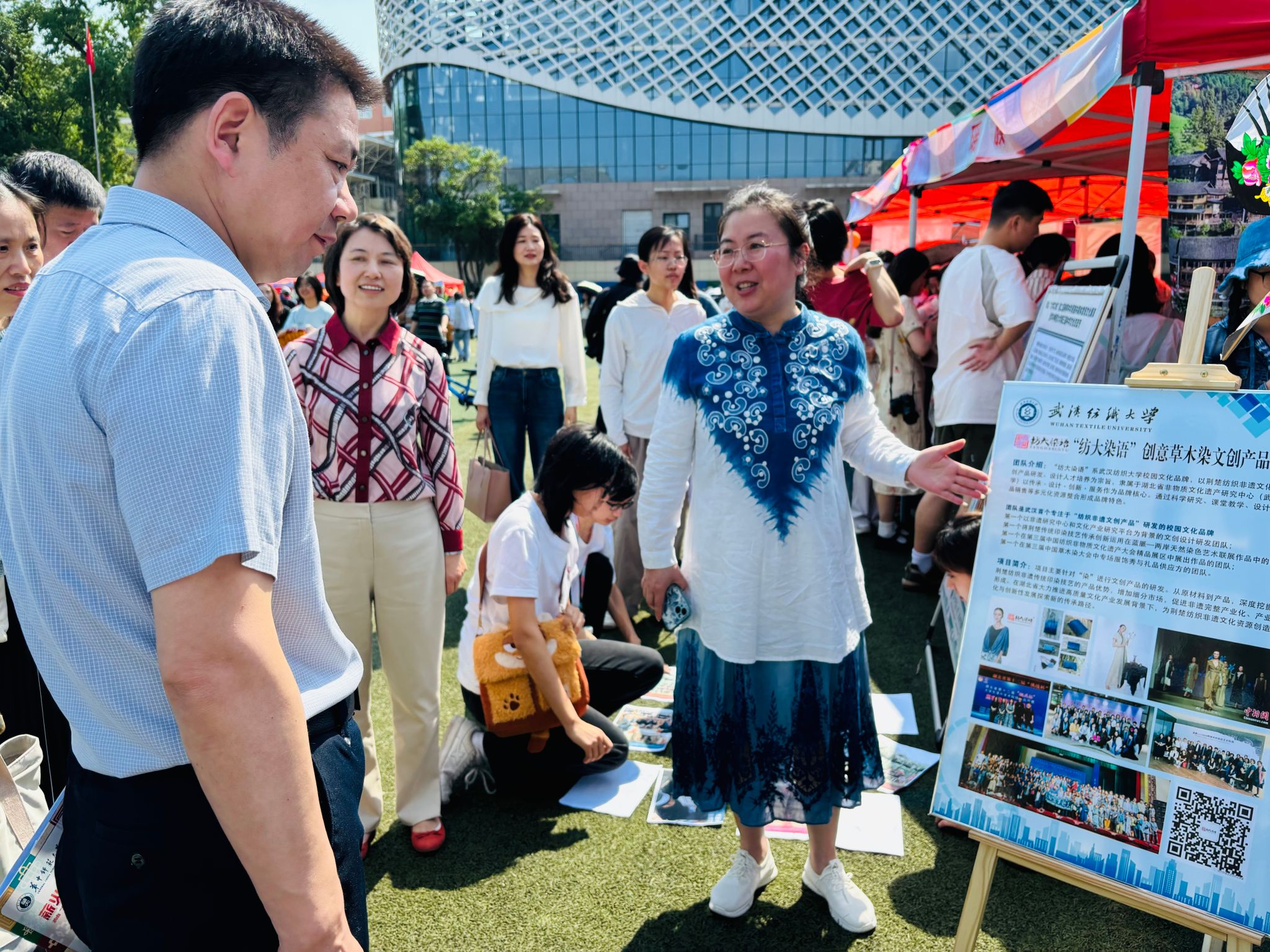 在这次活动展区中纺大染语团队带来了湖北蓝染产业基地联盟最新与非遗传承人合作的蓝染产品,主要以手工蓝染的耳环、手链、手包、胸针、团扇、手账本以及苗族挑花产品。现场五位研究生身着自己设计染色的蓝染服装,吸引了与会领导和嘉宾们参观,纷纷赞叹纺大非遗印染团队的产品设计力量很强大。洪山区与华中师范大学校领导们驻足参观,其中国家文化产业研究中心主任孙传明教授赞叹道:我们今后一定会持续和纺大染语团队加强合作,在非物质文化遗产的传承与创新中,华大国产中心非常需要像王妮副教授团队这种能从理论到实践全链条进行区域性非遗保护创新的研究团队。