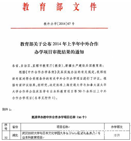 近日,教育部下发《关于公布2014年上半年中外合作办学项目审批结果的通知》,我校与日本文化学园大学联合申报的服装与服饰设计专业本科教育项目顺利获批,成为我校继中英曼彻斯特大学纺织工程项目之后获批的第二个本科层次中外合作办学项目。