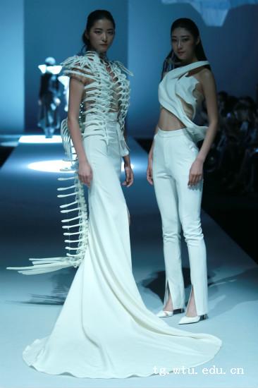 熊兆飞:这次发布会最明显的亮点在于我们着力将服装艺术与时尚相结合、与科技相结合、与市场相结合的态度。在今年的毕业设计过程中,指导老师们在引领学生关注时尚的基础上,强调个人对于作品的理解以及面料的革新与创造。值得一提的是,服装面料创新方面,首次出现了两组运用3D打印技术对服装进行设计的作品,在设计过程中,师生通过共同努力力求科技与时尚的完美契合。