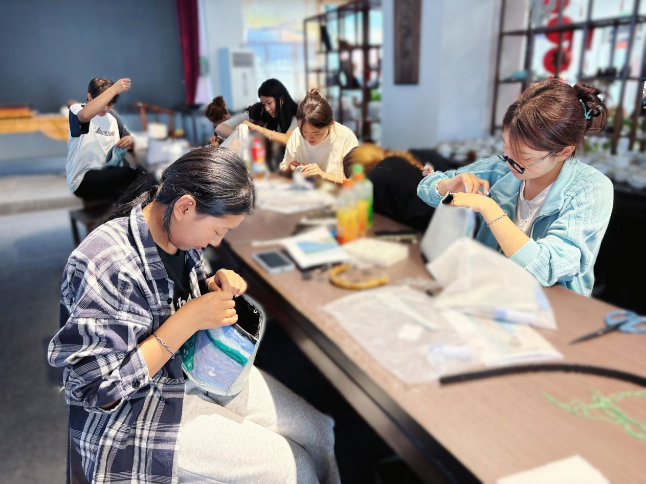 24名师生及6位本地手工爱好者组成。怀着对传统技艺的热爱,他们在纺大非遗中心专家的悉心指导下,系统学习了针毡工艺与汉绣特色针法,并围绕赛里木湖主题进行创意设计实践。课堂上,学员们专注实操,交流热烈,学习氛围浓厚。结业后,学员作品在博州大巴扎和赛里木湖景区展出销售,广受游客青睐。