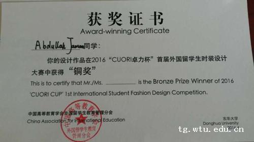 ABDULLAH JAMAN同学来自孟加拉国,从小就对服装设计有着浓厚的兴趣。本科毕业后获得我校校长奖学资助,于2015年11月来到我校中国体育博彩