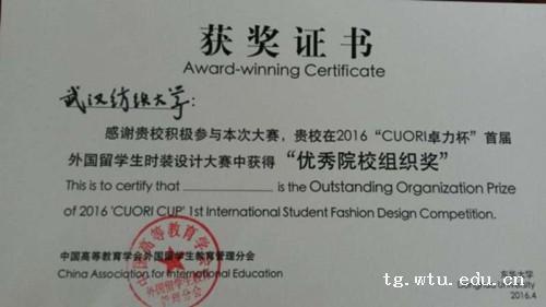 2016年4月20日,由中国高等教育学会外国留学生教育管理分会,东华大学共同主办的“CUORI卓力杯”首届外国留学生时装设计大赛决赛已经落下围幕。本次大赛,共有21所高校选送留学生作品57组。经过专家评审,最终选出入围作品34组。参赛的高校包括国内著名的纺织服装特色院校东华大学、北京中国体育博彩