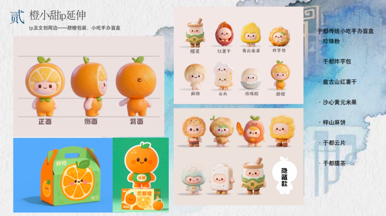 设计食品类IP 6个(橙小甜、橙酷仔、番小阳等)、文化类IP 1个(松小毅)、非遗类IP 2个(织娃娃、茶小灯),共9个核心IP。
