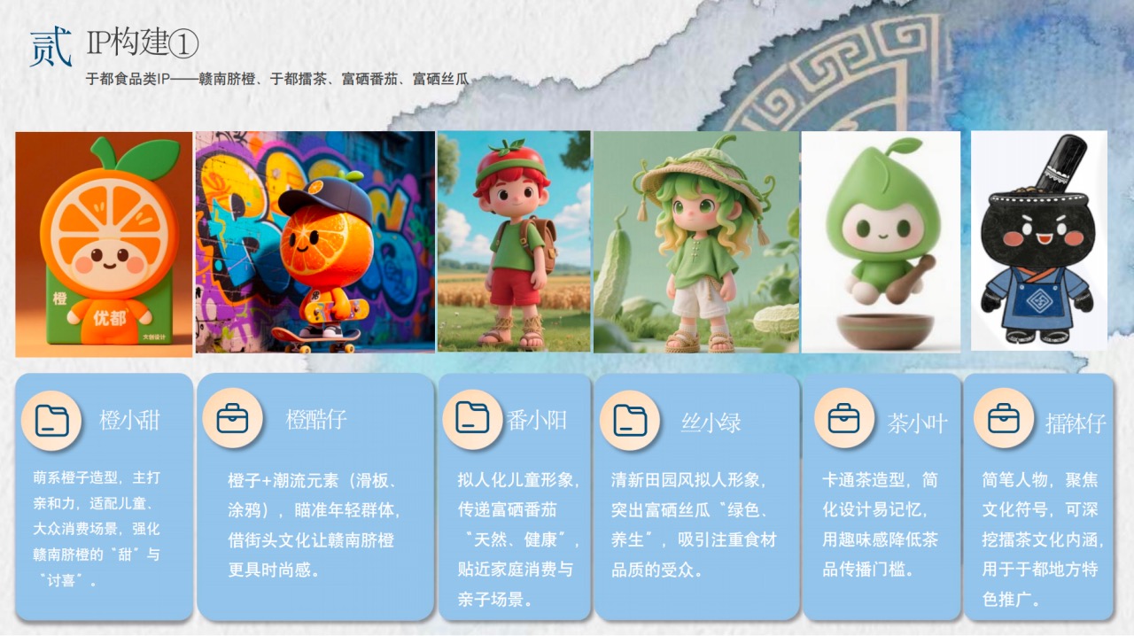 打造了多元文化IP,涵盖食品类(如赣南脐橙的“橙小甜”“橙酷仔”,擂茶的“茶小叶”“擂钵仔”等)、文化类(如象征长征精神的“松小毅”)、非遗类(如畲族蓝染的“织娃娃”、茶篮灯的“茶小灯”)。这些IP以萌趣、潮玩化设计,将传统元素转化为年轻群体易接受的符号。