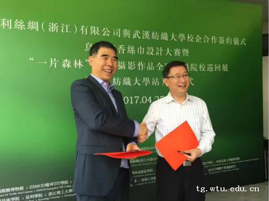 4月25日上午,我校与达利丝绸(浙江)有限公司校企合作签约仪式在南湖校区图书馆隆重举行,同时,由达利丝绸赞助的“鸟语花香”丝巾设计大赛暨“一片森林”林平摄影作品全国纺织院校巡回展正式开幕,达利丝绸(浙江)有限公司董事长林平、武汉纺织大学校长彭育园、副校长黄运平莅临现场,参加本次活动的还有我校科技处、图书馆、期刊社、材料中国体育博彩