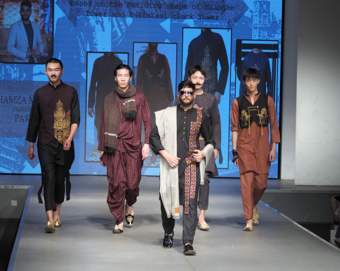 如来自巴基斯坦的几位同学分别将巴基斯坦传统的刺绣和装饰元素应用到现代高级时装、利用巴基斯坦的建筑造型--钟楼与武汉黄鹤楼图案元素对库尔塔服装进行创新设计以及将巴基斯坦卡车艺术图案创新应用女装设计中,表达出南亚流行艺术与服装设计的融合,展现文化复兴的新时尚等。来自孟加拉国的同学将孟加拉传统工艺与甘茶织物结合设计出不同风格的休闲成衣,将不同的传统和文化融合到现代时尚中,利用传统的坎塔刺绣工艺和图案以及博罗等手工艺技术将旧服装重新设计,以减少服装浪费,倡导零浪费可持续的时尚方式等。还有同学利用珠宝装饰和卡达布创新设计女性办公服;将环保材料与当今时尚界独特的传统和历史手工作品相结合重塑黄麻面料在服装设计中的应用;将激光切割技术应用到前卫服装设计中,创新设计出不同造型的前卫服装;利用手工制作三维纹理(金属、墙壁和土地等)面料并创新应用到女装设计中,赋予作品视觉的美感等。