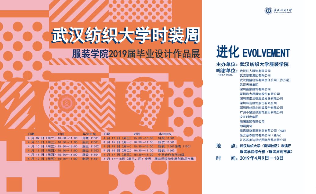 传播时尚文化,弘扬时代精神。2019武汉纺织大学时装周暨2019届毕业生毕业设计作品展将于2019年4月9日在南湖校区表演厅启幕。