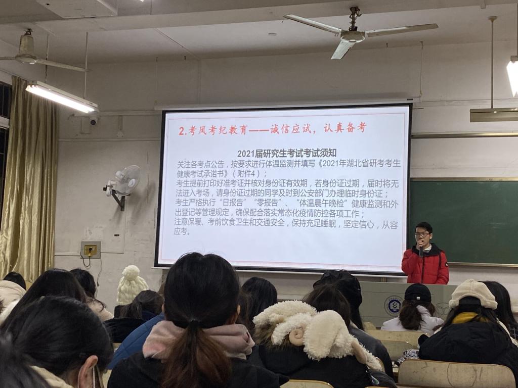 毕业班辅导员则着重向年级学生强调了研究生入学考试考风考纪教育以及应考的防疫要求,提醒学生务必关注各考点公告,按要求进行体温监测并填写《2021年湖北省研考考生健康考试承诺书》;同时,提醒了学生严格执行“日报告”“零报告”、“体温晨午晚检”健康监测和外出登记等管理规定,确保配合落实常态化疫情防控各项工作;最后,提醒了学生注意保暖、考前饮食卫生和交通安全,保持充足睡眠,坚定信心,从容应考。