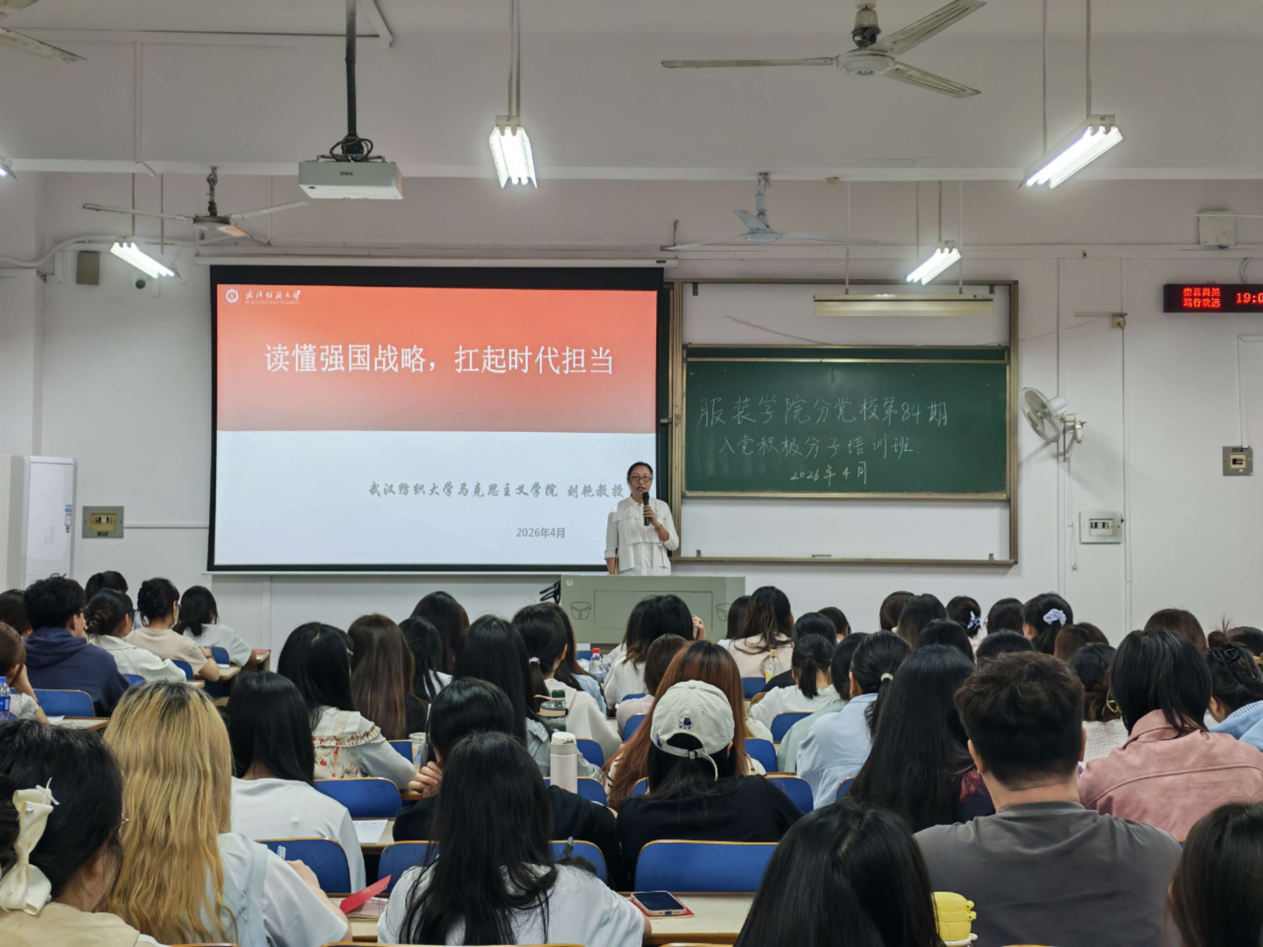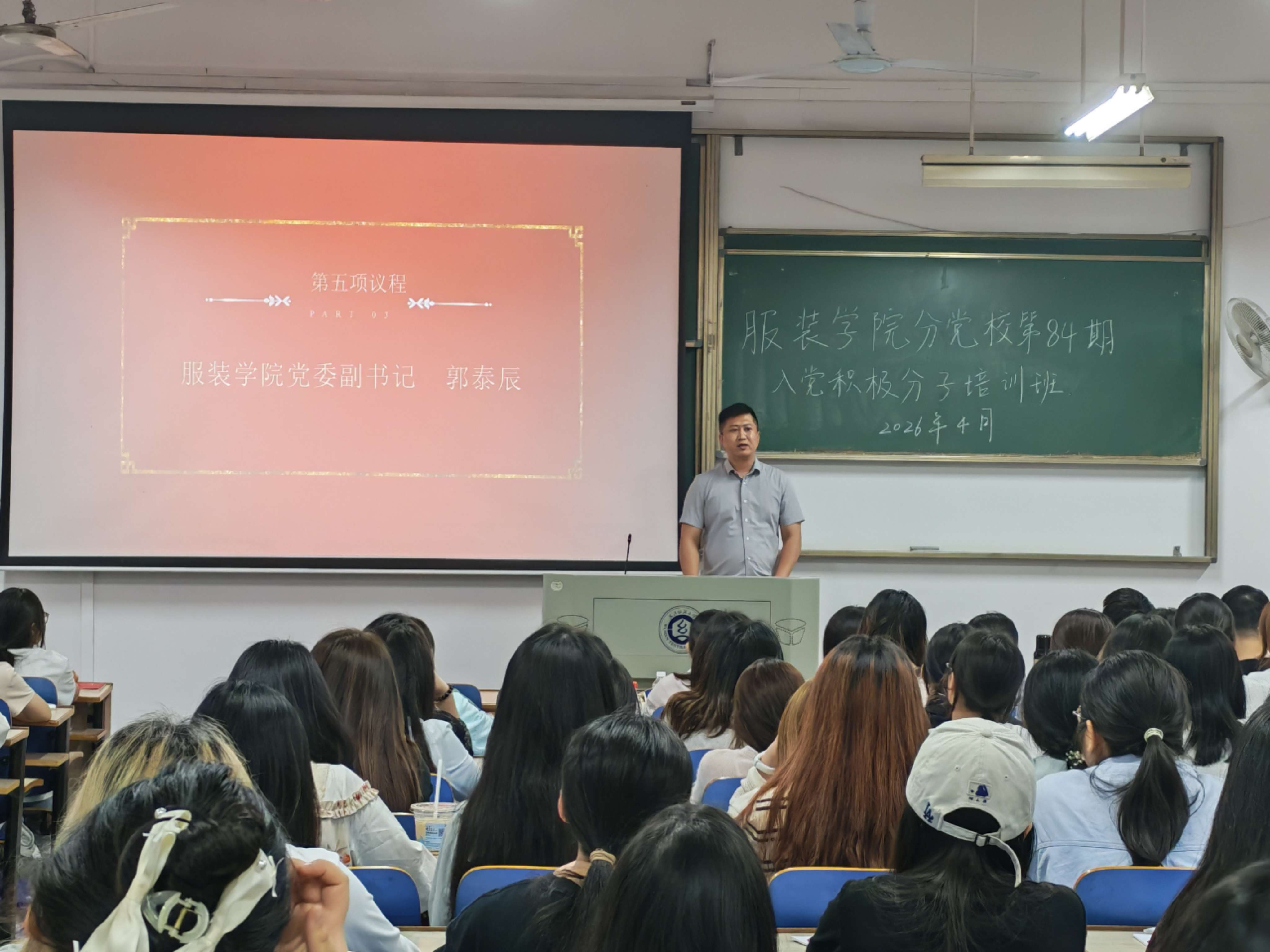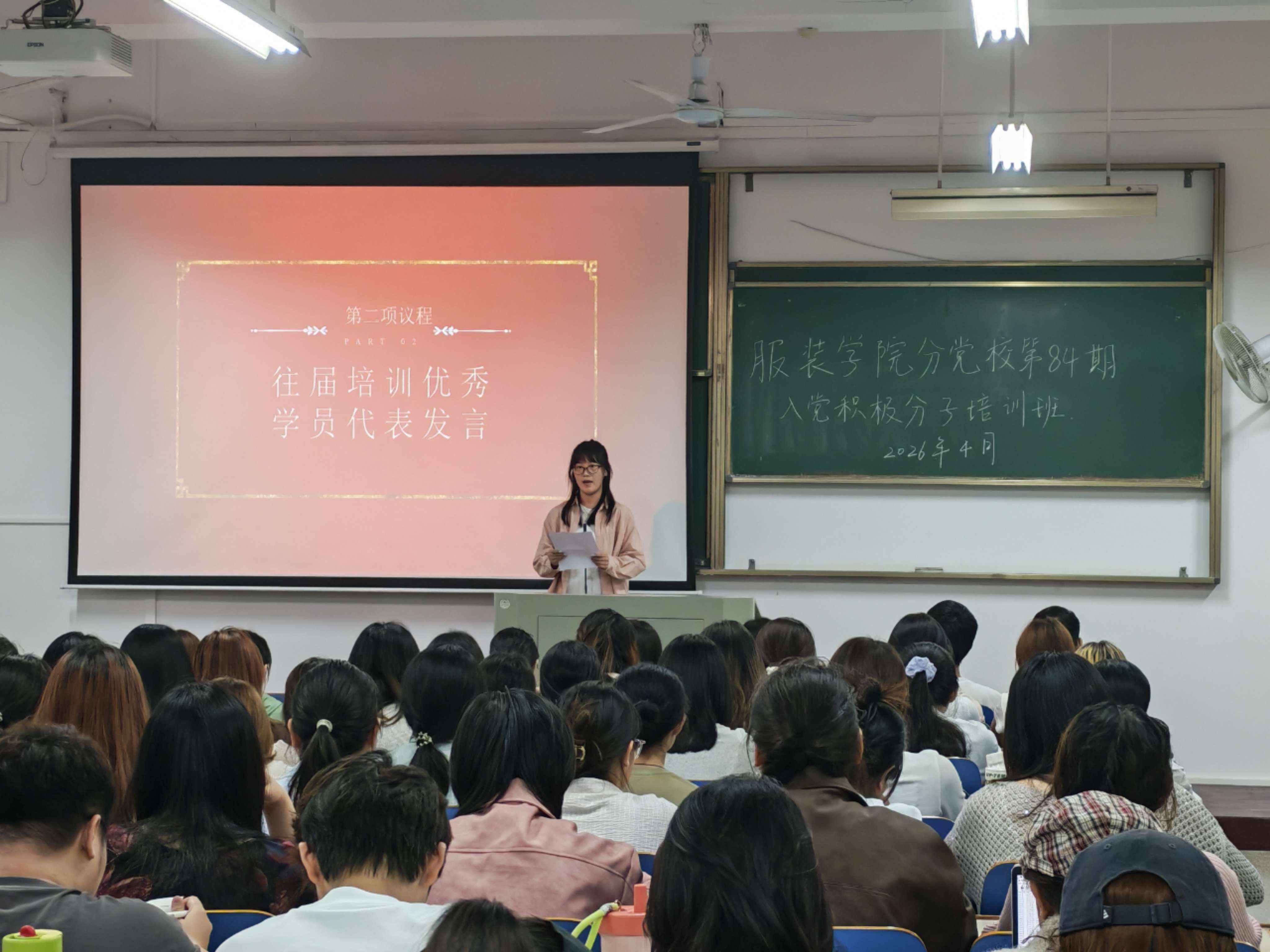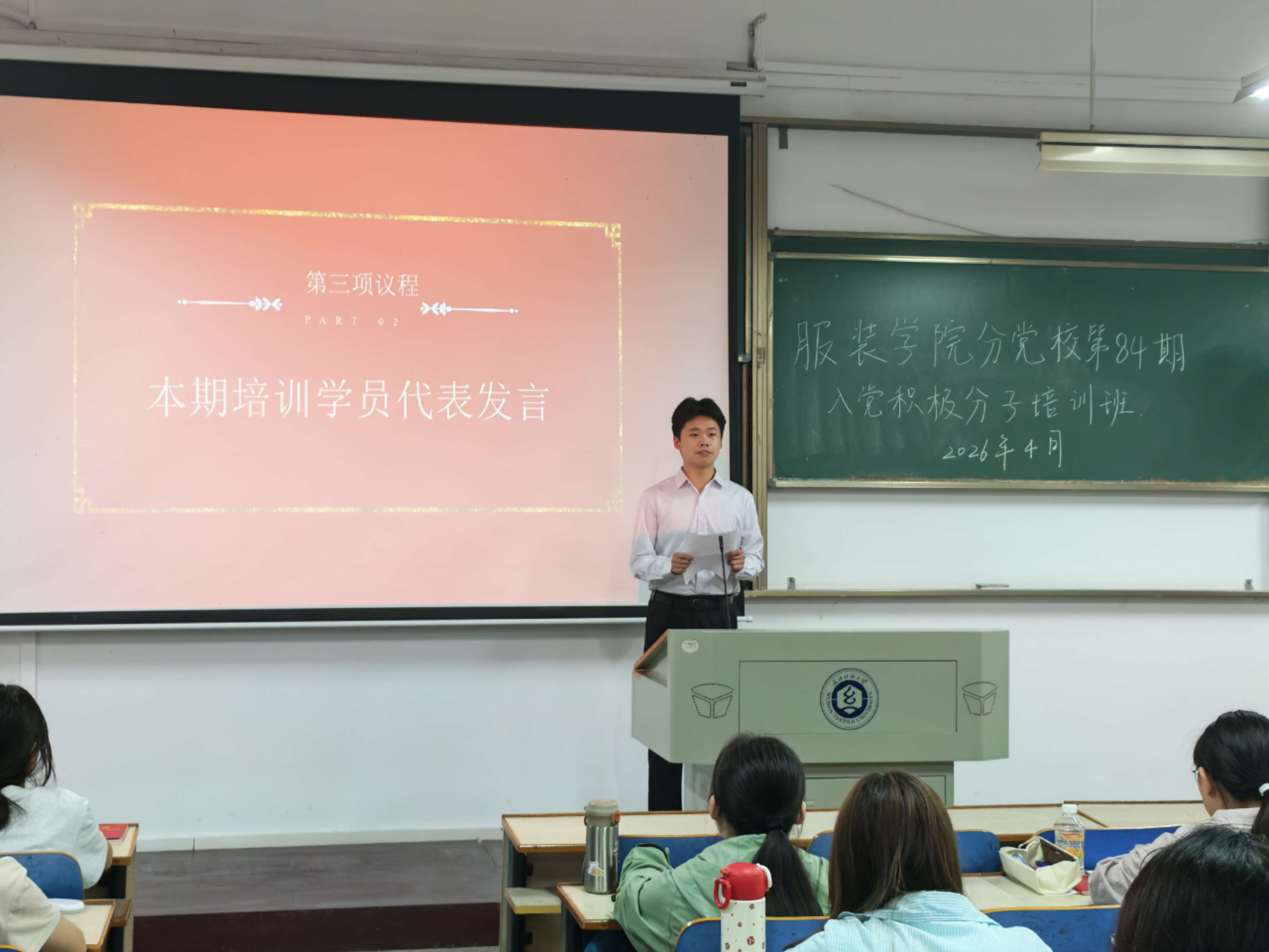 发展的未来中坚,作为服装专业的青年学子,大家既要扎实练就专业本领,深耕服饰文化传承,锤炼精益求精的工匠精神,将专业所长与国家发展、文化自信建设紧密结合;更要坚定理想信念,牢记初心使命,深刻领悟党的宗旨内涵,自觉用党的创新理论武装头脑、指导实践。他强调,全体学员要倍加珍惜此次培训机会,认真钻研党的理论知识,进一步端正入党动机,严格遵守培训纪律,立足专业实际,将红色基因融入设计创作,把个人理想融入党和人民的事业,在勤学苦练中锤炼政治品格、增长过硬才干,努力成为政治坚定、专业扎实、作风优良的新时代青年先锋。