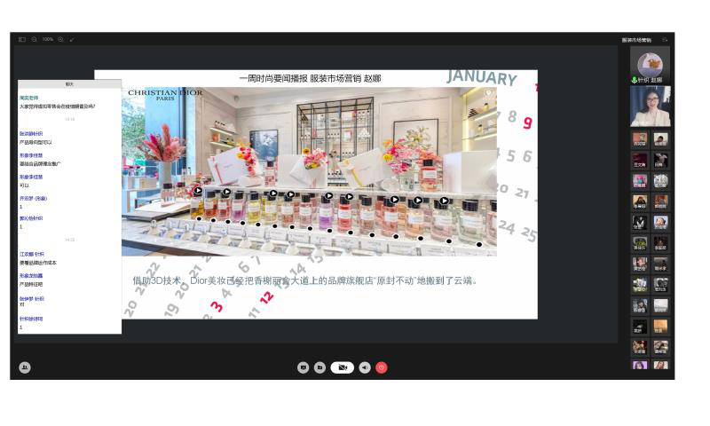 作为一名海归,硕士毕业于法国尚伯雷恩大学时尚贸易与管理专业的周奕老师,从国际视野开展《服装市场营销》的线上教学,她充分结合服装贸易专业的发展需要,对教学内容作了一些延展处理,帮助学生了解和体会全球疫情对于时尚产业造成的深远影响。由此,她设计了一些特色教学环节, 比如课前10分钟分组进行“一周时尚要闻播报”,让学生通过收集最新的时尚产业动态信息,整理出最具代表性的新闻主题,聚焦危机中的行业变化,这种时尚互动的方式不仅调动了学生的学习兴趣,也让他们开拓了视野,经过近一个月的的尝试,学生逐步掌握了分析现象、提出问题和独立思考的方法,对于时尚品牌的VR(虚拟现实)时装秀、奢侈品品牌数字化探索的进程(直播)以及产业可持续的发展方向有了更深入的认识。