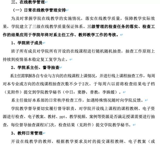 建立了院、系、督导三级督课体系,设置网上督课信息快速反应程序、成立网课智囊团队提供技术指导、采取一对一的帮扶、协同学工狠抓网上教学学风建设等一系列有效的措施来确保疫情期间教学的有序化和高质化。