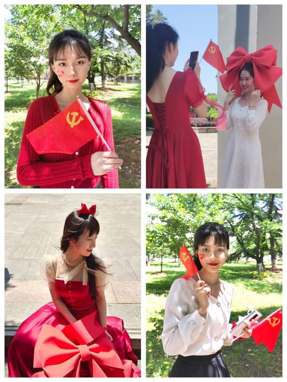 活动现场贯穿着丰富的红色元素,刺绣的党旗、历史厚重的汉服、温婉大气的旗袍、仙气飘飘的红裙子、带有纺大LOGO的红窗花、带有节日气息的红风车、红领结..........活动设计充分展现服装专业元素,利用服饰搭配、服装展示、智能服装大数据等方式充分挖掘红色育人资源,使红色基因渗入血液、融入血脉、浸入心扉,落地生根,服装青年学子以这样特有的方式表达对党的赤诚之心。