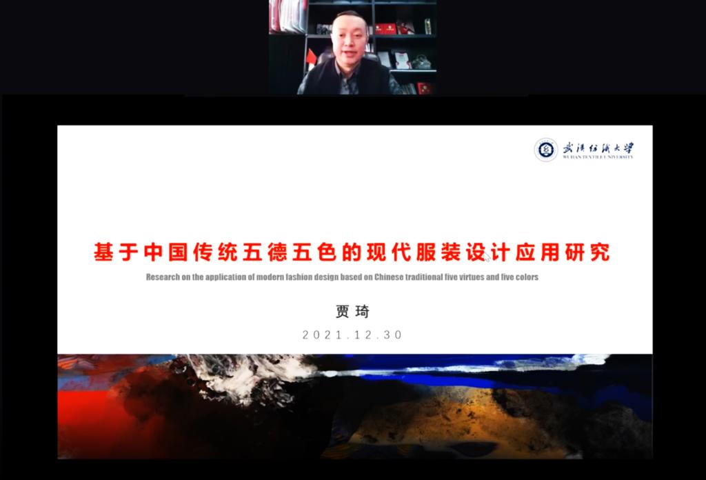 贾琦教授以《基于中国传统五德五色的现代服装设计应用研究》为题,重点探讨了中国传统五色的活化应用。从中国传统五行、五德、五色基础理论研究入手,分析不同朝代在各自德运下所崇尚的色彩,通过COLORO色彩体系对中国主要朝代典型服饰色彩进行了分析,从侧面印证了当时服饰的整体色彩风貌。并将中国少数民族服饰中五色遗存进行了梳理,对当下以中国传统元素为核心的设计师品牌、国潮品牌、汉服品牌中的五色应用情况进行了调研,对2020东京奥运会各国代表团服饰色彩进行了分析,探索中西方色彩应用异同。最后通过设计实践作品展示活化应用过程。