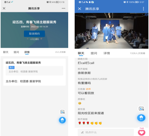 师生的部分优秀作品。同时为了促进学校两校区的文化活动交流,此次服装秀活动在校信息中心的大力支持下,采取了线上和线下同步进行了方式,两校区近1500名学生通过线上线下的方式参与了同步观看。