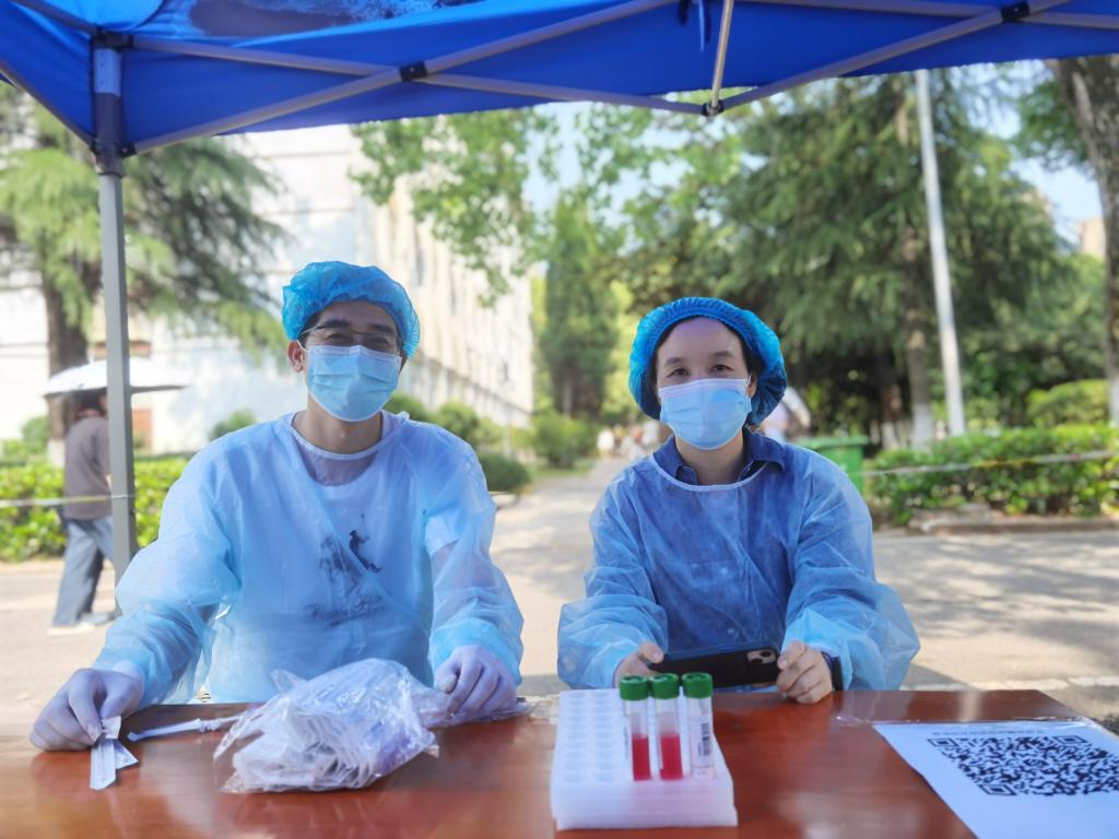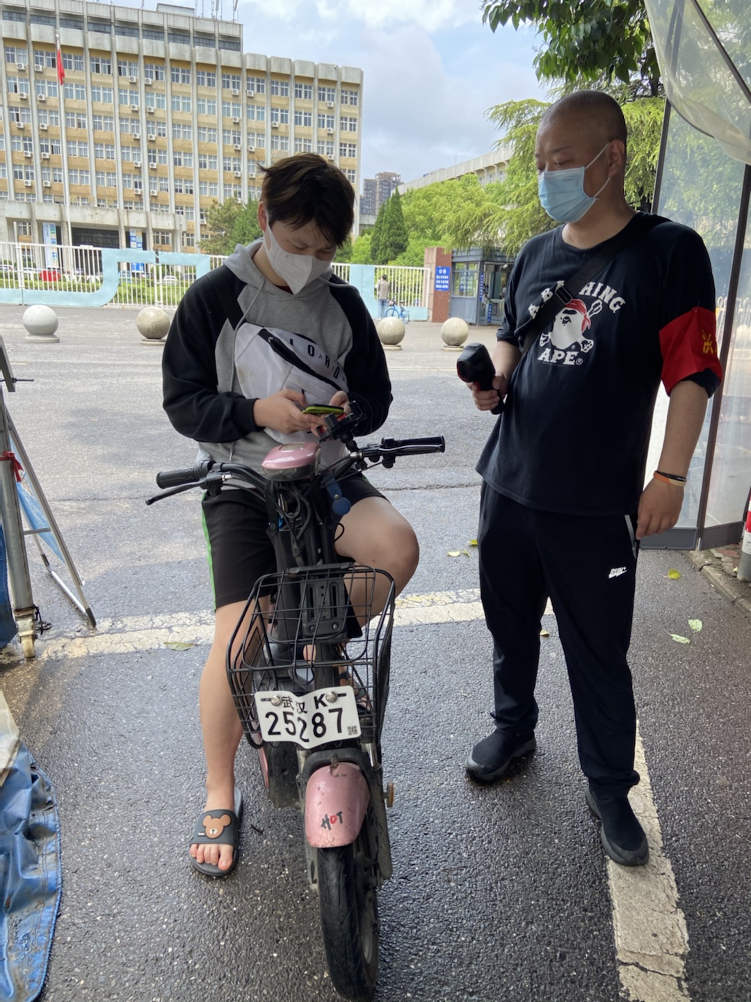 4月24日,不畏烈日坚守岗位的程伟、张丹老师