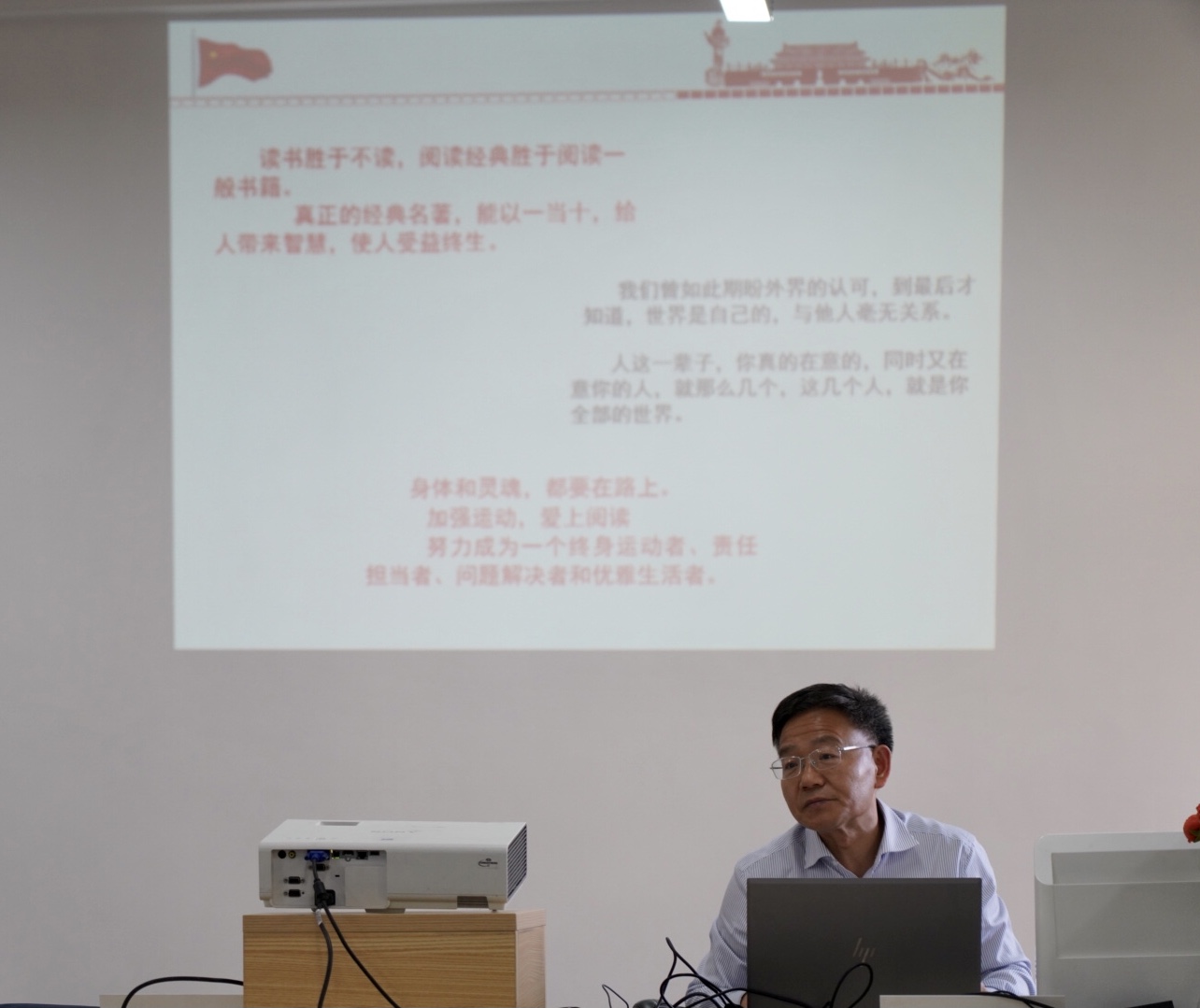 五一趣味活动的主题“身体和灵魂,都要在路上”结束本次分享会,号召全体同学加强运动,爱上阅读,努力成为一个终身运动者、责任担当者、问题解决者和优雅生活者。