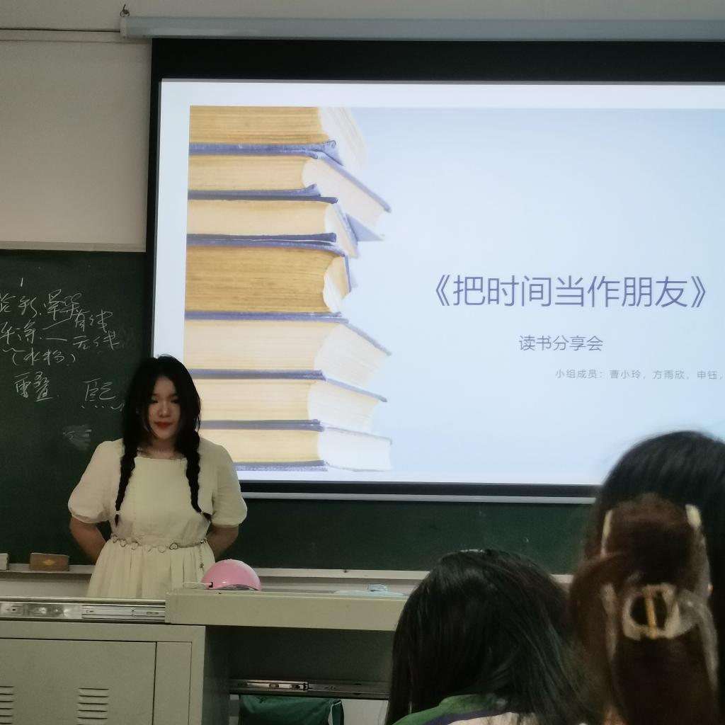 服设12105班的曹晓玲,申钰,祝贝,方雨欣,他们分享的书籍是《把时间当朋友》。这本书从心智成长的角度来谈时间管理,指出时间管理是成功的关键所在。作者引述自己从事的职业中所遇到的事例,告诉我们:如何打开心智,如何运用心智来和时间做朋友,如何理解时间管理的意义,在时间管理上取得突破,进而用心智开启自己的人生成功之旅。