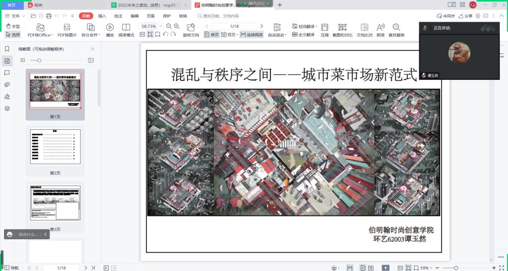 谭玉然同学分享了“混乱与秩序之间—城市菜市场新范式”,她尝试将“生存美学”融入建筑设计,用“生活的艺术”构建出了属于农民的“身份”,“地方感”以及“自我认同感,帮助农民找到自己的社会价值,形成一种城市人与乡村人交流的折叠。回归城市“人文价值”的提供。