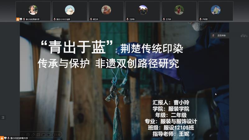服设12105班曹小玲同学就“青出于蓝”荆楚传统印染传承与保护非遗双创路径研究主题展开汇报。项目以荆楚纺织非遗文化传播、文创产品研发、设计人才培养为宗旨,以传承·设计·创新·服务作为品牌核心,搭建研究生、本科生创新创业教育与实践平台,通过科学研究、课堂教学、设计研发、产品销售等多元化资源整合形成品牌特色。
