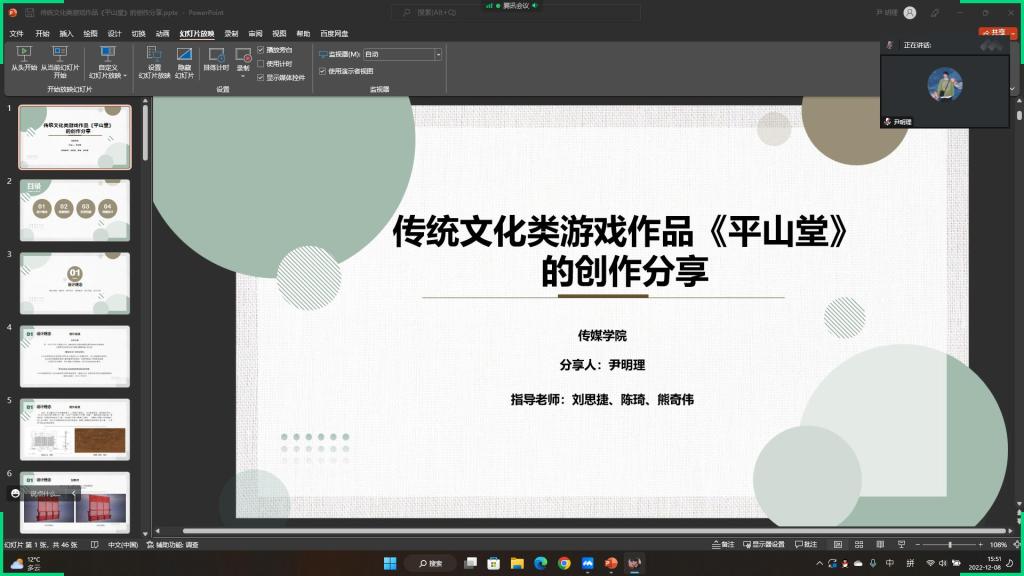 尹明理同学就传统文化类游戏作品《平山堂》的创作分享,传统文化类游戏作品《平山堂》的创作分享是一个关于宋代《营造法式》古籍的虚拟可视化复原与展示的构件拼接游戏。是基于尺寸和二维图样信息的三维复原以及拼接构件的游戏化形式展示《营造法式》小木作“阑槛钩窗”的内容。