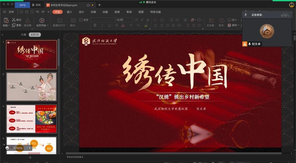 中日班刘文卓同学就“绣传中国”—“汉绣”绣出乡村新希望主题展开。项目基于14年来学校对于汉绣的实践研究,凝练出五维一体的公益创新服务模式。此次分享会将以团队在武汉市黄陂姚家山的实践活动作为基础,融合调研成果,介绍团队服务模式落地乡村后为当地带来的变化,以及同学们在实践过程中的锻炼收获。
