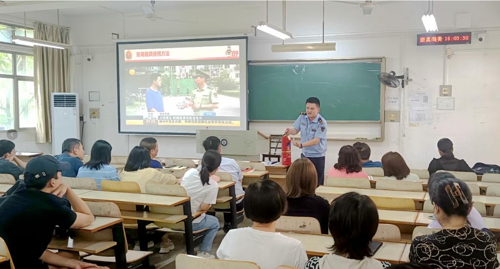 培训会上,蒋豪教官通过生动、幽默地向师生讲述了消防设施、器材性能并结合消防灭火实例,就疏散逃生的基本常识、消防火灾的应急流程以及预防、干粉灭火器的使用技术进行了讲解。