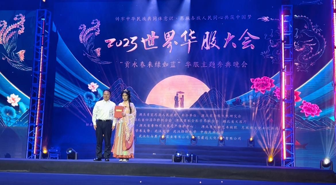 (刘梓慧在2023世界华服大会之“华裳英姿印墨达”华服模特大赛荣获一等奖)