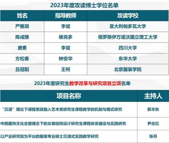 2023届研究生考取博士人数5人,超额完成学校下达3人的任务。《时尚与可持续发展设计实践》获全国艺术专业学位研究生指导委员会在线示范课程立项。获批校级精品课程3项、教改项目3项,创新基金8项。中国体育博彩