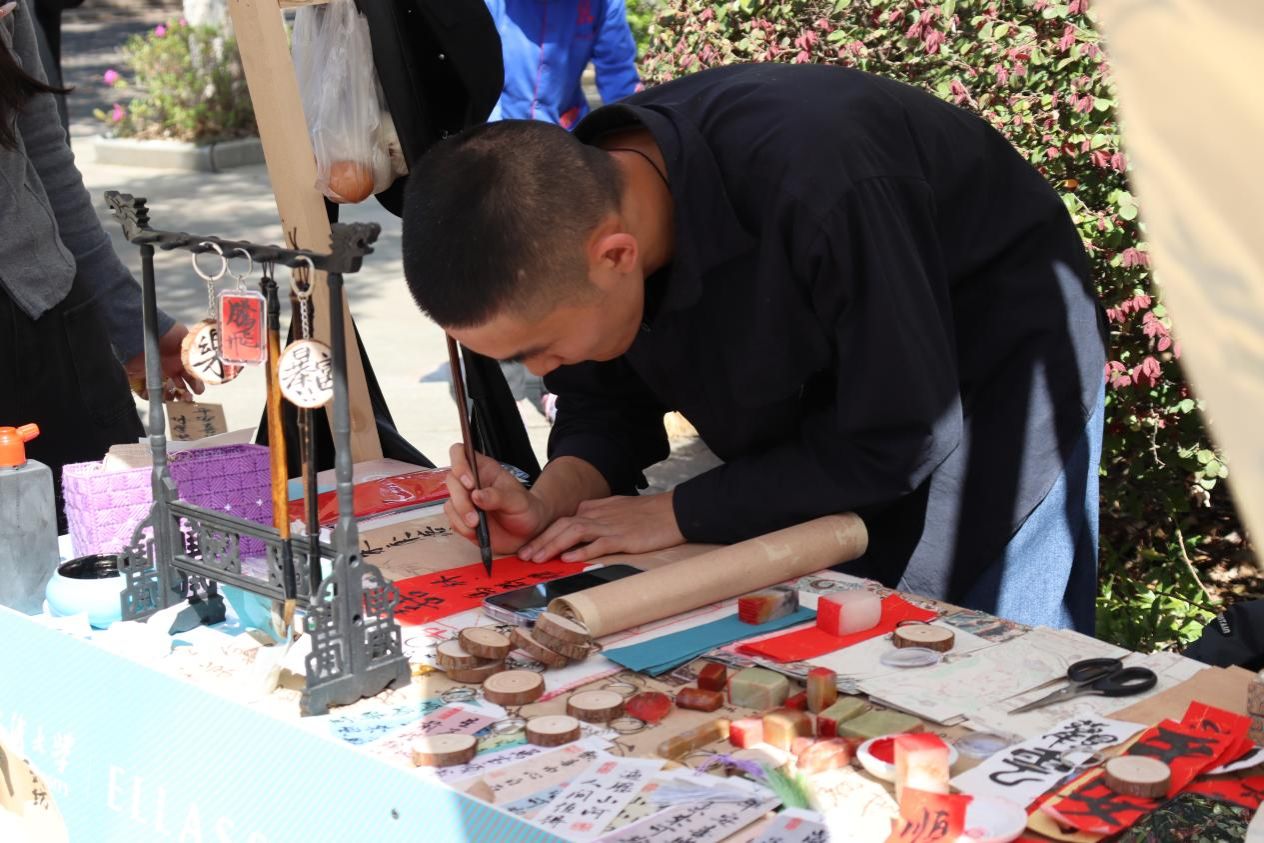 来自服设12204班的摊主朱俊表示,“翰墨怡情”源于传承弘扬中华优秀传统文化的活动宗旨,也是为了发扬中国渊源流长的书法文化,我们将中国的文化精粹“书法”以一种别样的形式转化为书签,钥匙扣,印章等小商品进行售卖展出,我们有特殊的互动环节,现场接受来字定制,说出自己想写的字便能让顾客亲眼见证书写过程,体会书法过程中的提按顿挫,墨香四溢,最后盖上心仪的印章,书法的魅力便从商品的媒介进入到了每一个顾客和游者的心中,希望借此次活动让更多人爱上书法,喜欢书法。