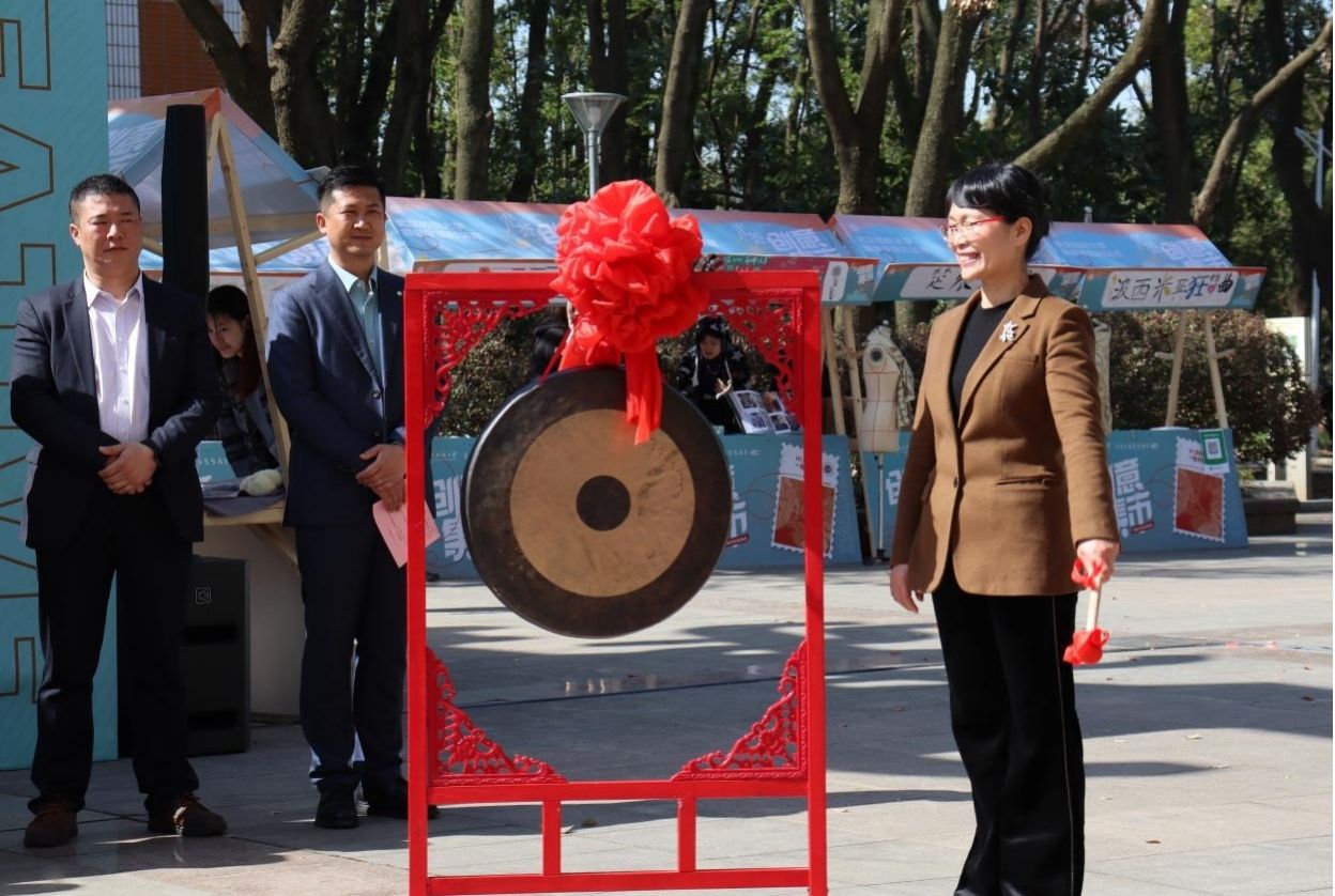 院长陶辉教授为创意集市敲响吉祥的锣声,学生工作部(处)、校团委、创新创业中国体育博彩