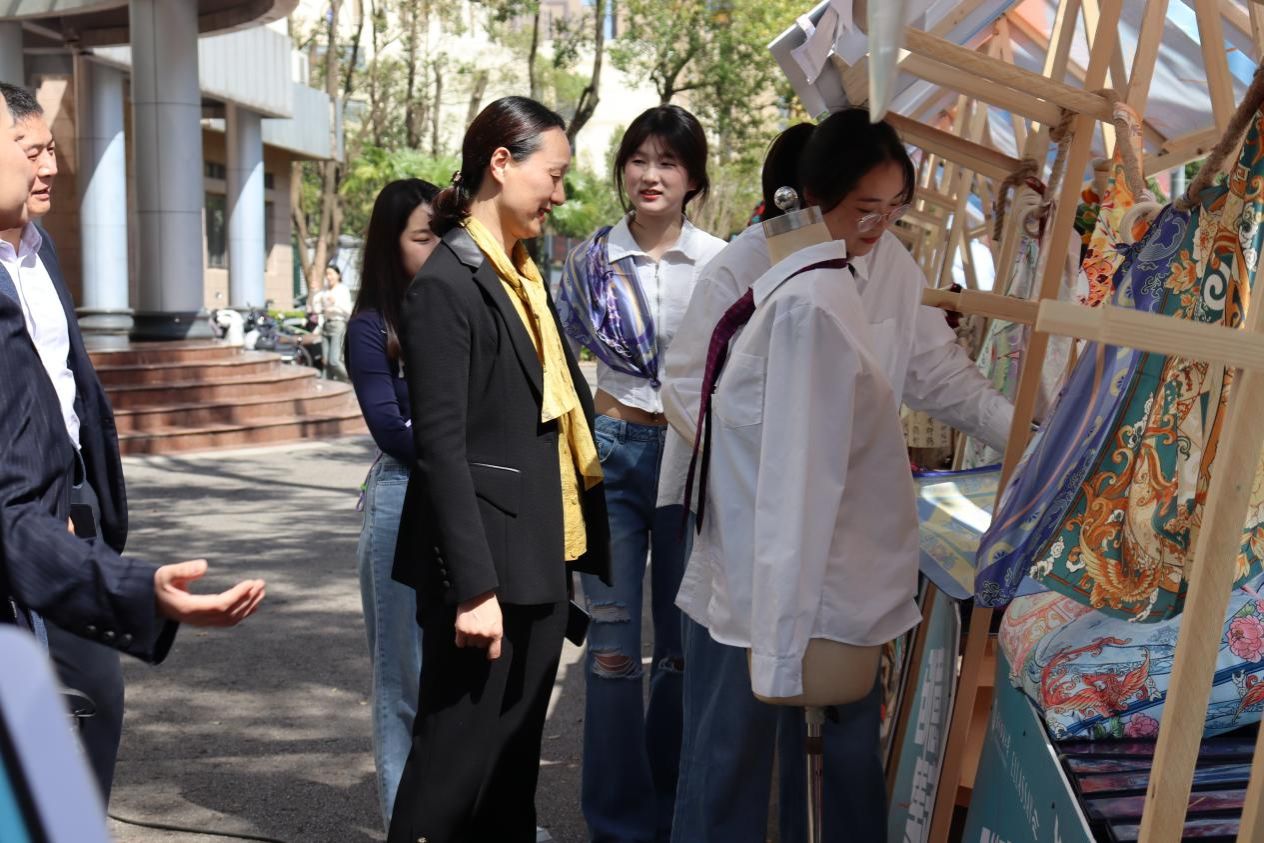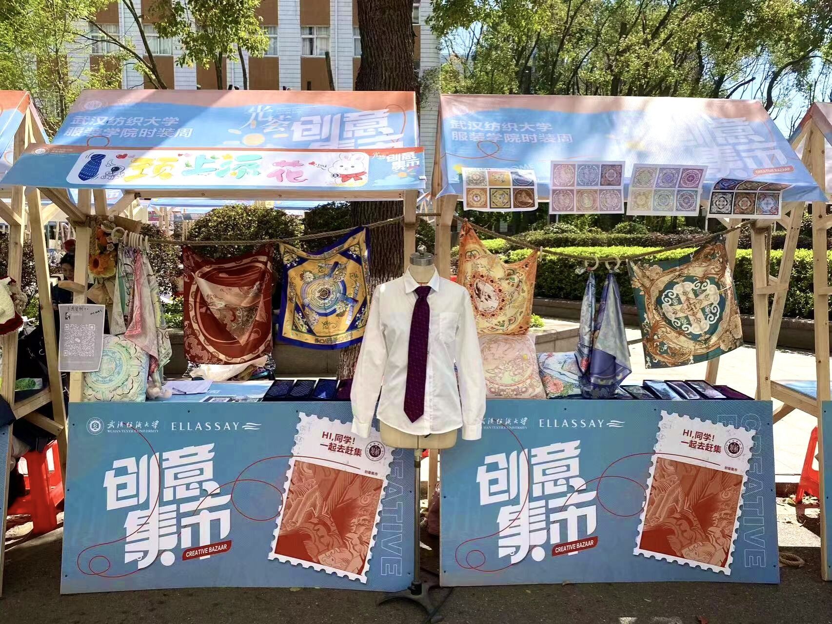 这个摊位是由本科生和研究生共建的团队,她们积极将自己设计源动力融入美好纺大的建设中,主动关注崇真尚美的校训努力践行创新实践,在2023年国家级大创项目支持下,以我校纺织科技助力航天强国为理念,提取中国传统飞飞行文化的缠枝蝙蝠纹、苍穹之花、楚凤等吉祥纹饰集合宇航员元素设计原创丝巾。领带则围绕学校文化IP的形象延伸品为思路,设计以学校logo为核心的系列领带。在创意集市完成了“作品”到“产品”的转换,这些代表纺大特色文创产品得到中南干训班领导学员们的青睐,纷纷扫码现场购买或定制。还有周边高校的老师也在闲逛中定制了多条设计新颖独一无二的真丝丝巾,不到一天销售流水已经过千,对同学们的创新精神和设计能力给与支持和肯定。