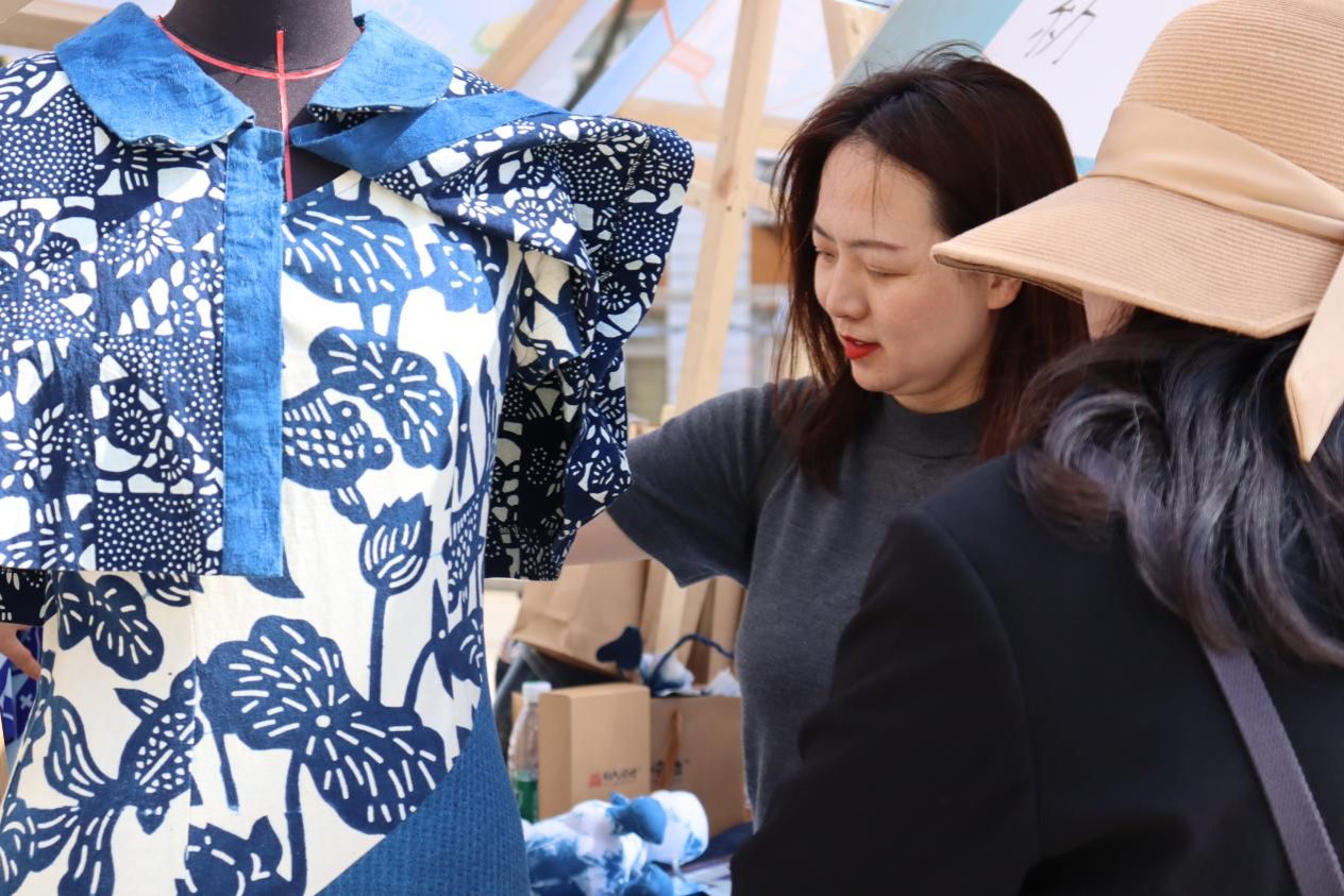 来自纺大染语团队的摊主表示,泱泱大国中华五千年璀璨文明,荆楚大地蕴含着我国最早的蓝染文化根脉基因。1987年在湖北出土的楚怀王墓中的竹简上发现了目前中国已知最早的汉字“蓝”,可以看出早在两千多年前的楚国宫廷就设立了“蓝尹工官”专门负责靛蓝染色,从而造就了绚丽多彩的楚国服饰文化。武汉纺织大学纺大染语团队历经十余年,深耕楚蓝文化研究,积极成果转化,长期深耕荆楚纺织非遗文化资源与文化产业方向研究,主要聚焦荆楚传统印染文创产品设计开发。