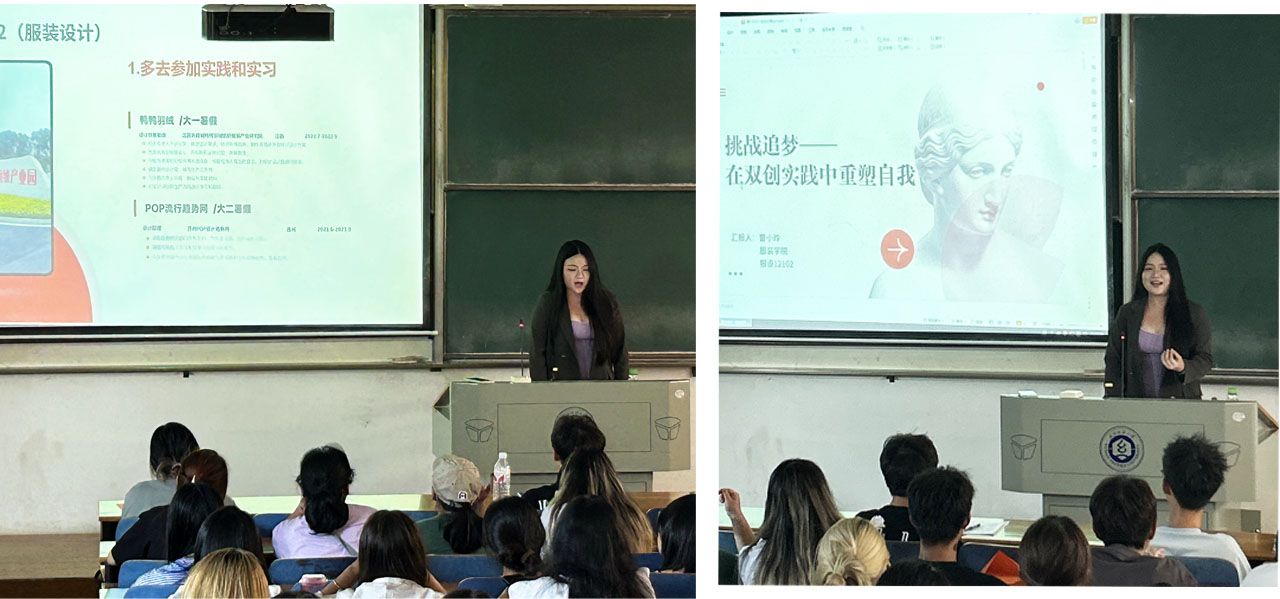 服设12102班曹小玲以《挑战追梦——在双创实践中重塑自我》为题,从大学三年的学习、比赛和社会实践心得三个方面展开,分享了她在中纺联双创大赛中积累的双创经验。她强调了有效利用资源、团队协作和创新能力在双创实践中的重要性,并鼓励同学们勇于挑战自我、追求卓越。曹小玲的分享不仅展示了她的个人成长轨迹,也为在场艺术类专业学生提供了宝贵的启示和借鉴,激发了大家对于大学生活的热情和信心。
