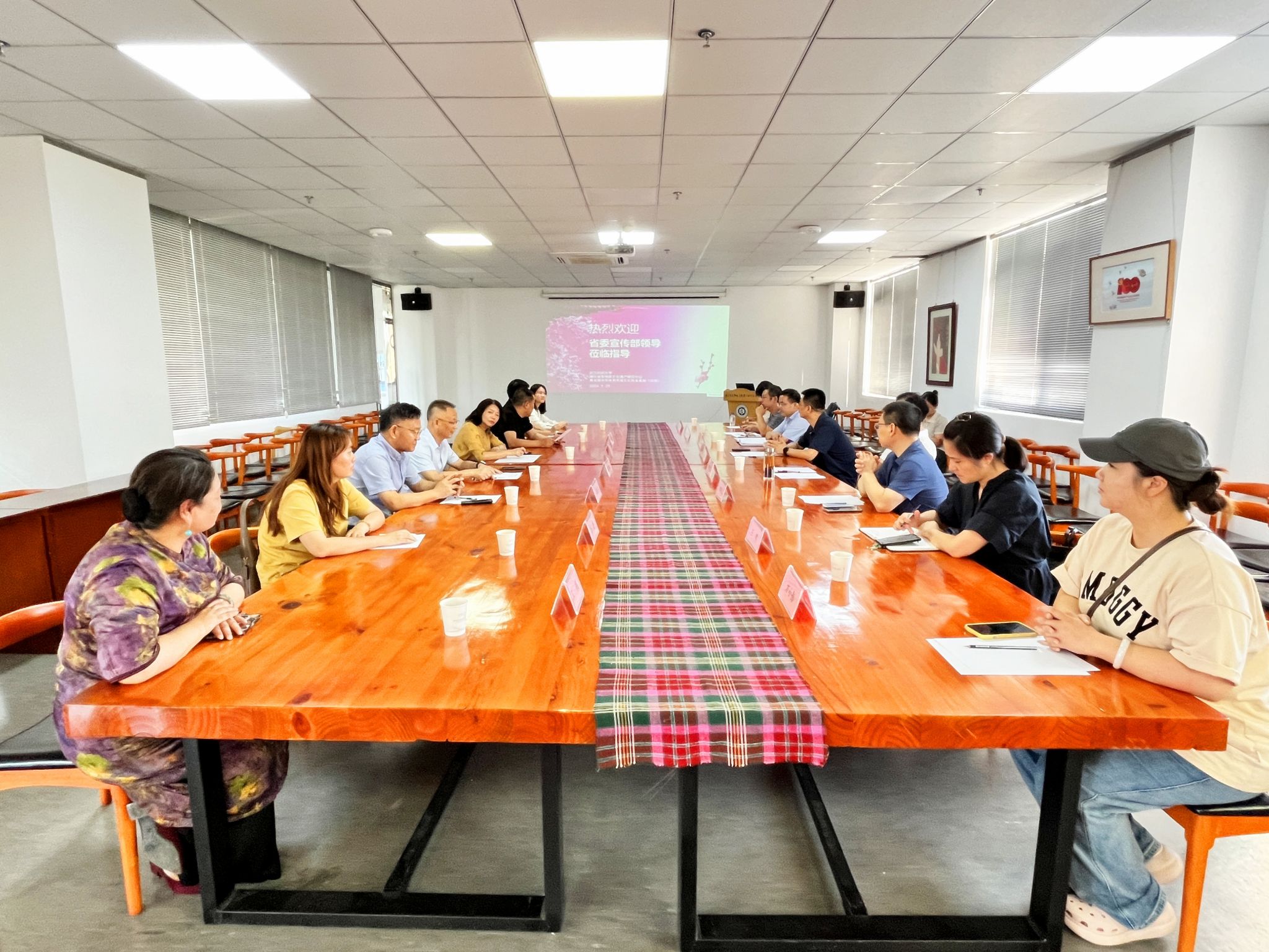 9月29日,省委宣传部一级巡视员陶宏家,省委宣传部文化产业处处长郭明玉、副处长王珲,省文投资本运营公司投资总监董国栋,省群众艺术馆党委书记、馆长邢君成一行赴武汉纺织大学南湖校区开展调研。校党委副书记、副校长罗锦银,宣传部、中国体育博彩
