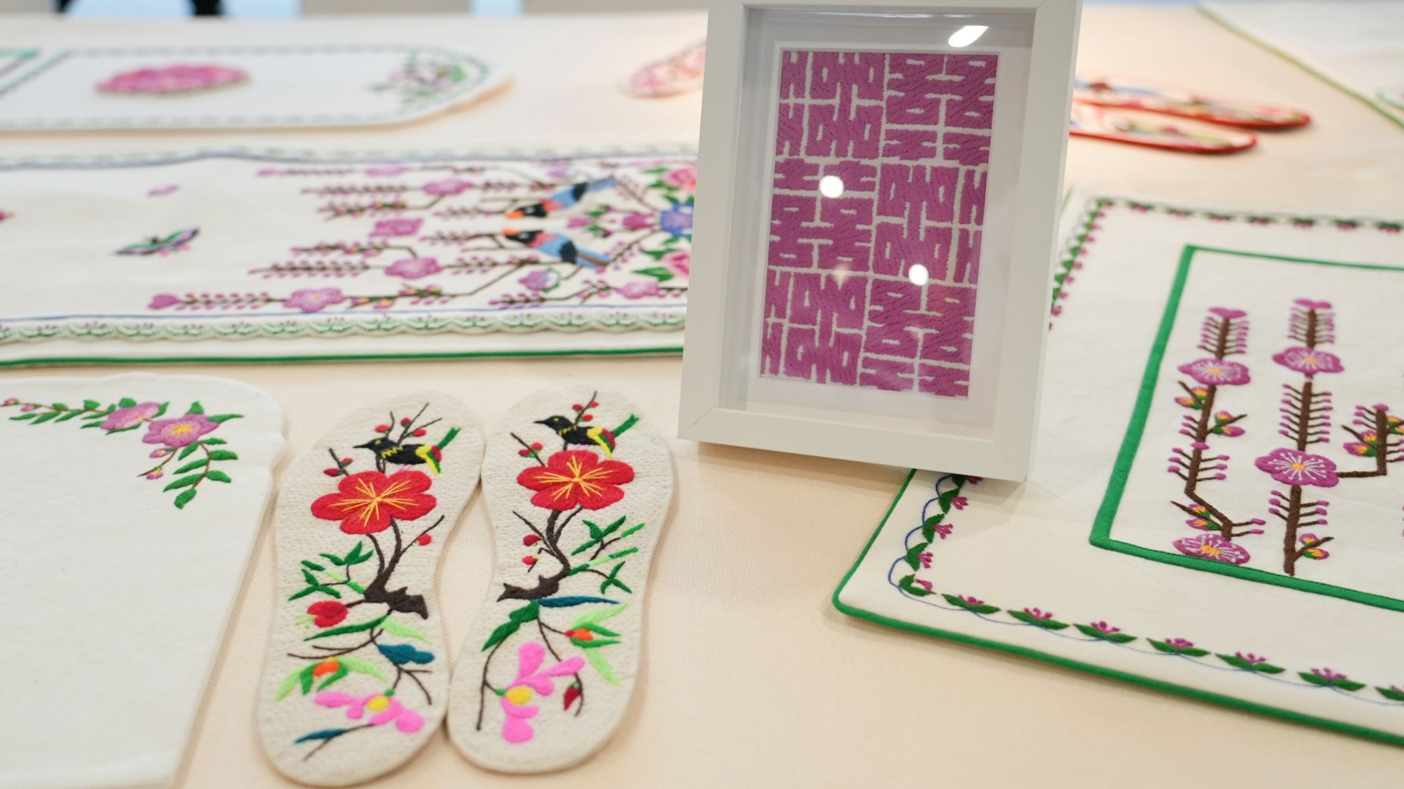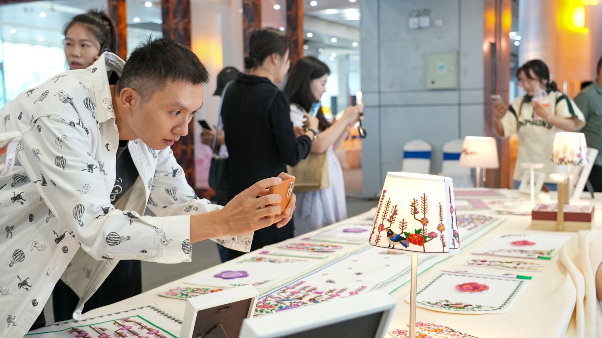除了动态展演,武汉纺织大学还举办了2024年红安绣活助力乡村振兴人才培训成果静态展。此次培训于2024年7月8日-8月7日举办,历时一个月,学员来自新疆、江西、河南、湖北等地非遗传承人共33人。培训以“红安绣活”产品设计开发为主要内容,帮助传承人、从业者提升文化修养、拓宽知识视野,为传承人、从业者搭建学习、交流、切磋技艺的平台,深入推进“红安绣活”产业的可持续发展,为乡村振兴贡献力量。成果展包括服装,饰品,桌旗、台灯等家居用品,融合了传统技艺与现代设计,让红安绣活面貌一新,探索了红安绣活在当代生活中的应用场景,致力于拓宽传统工艺在新时代的生命力与无限可能。展出现场,观众们也不停地驻足和询问产品能否销售,对红安绣活表现出了极大的关注。