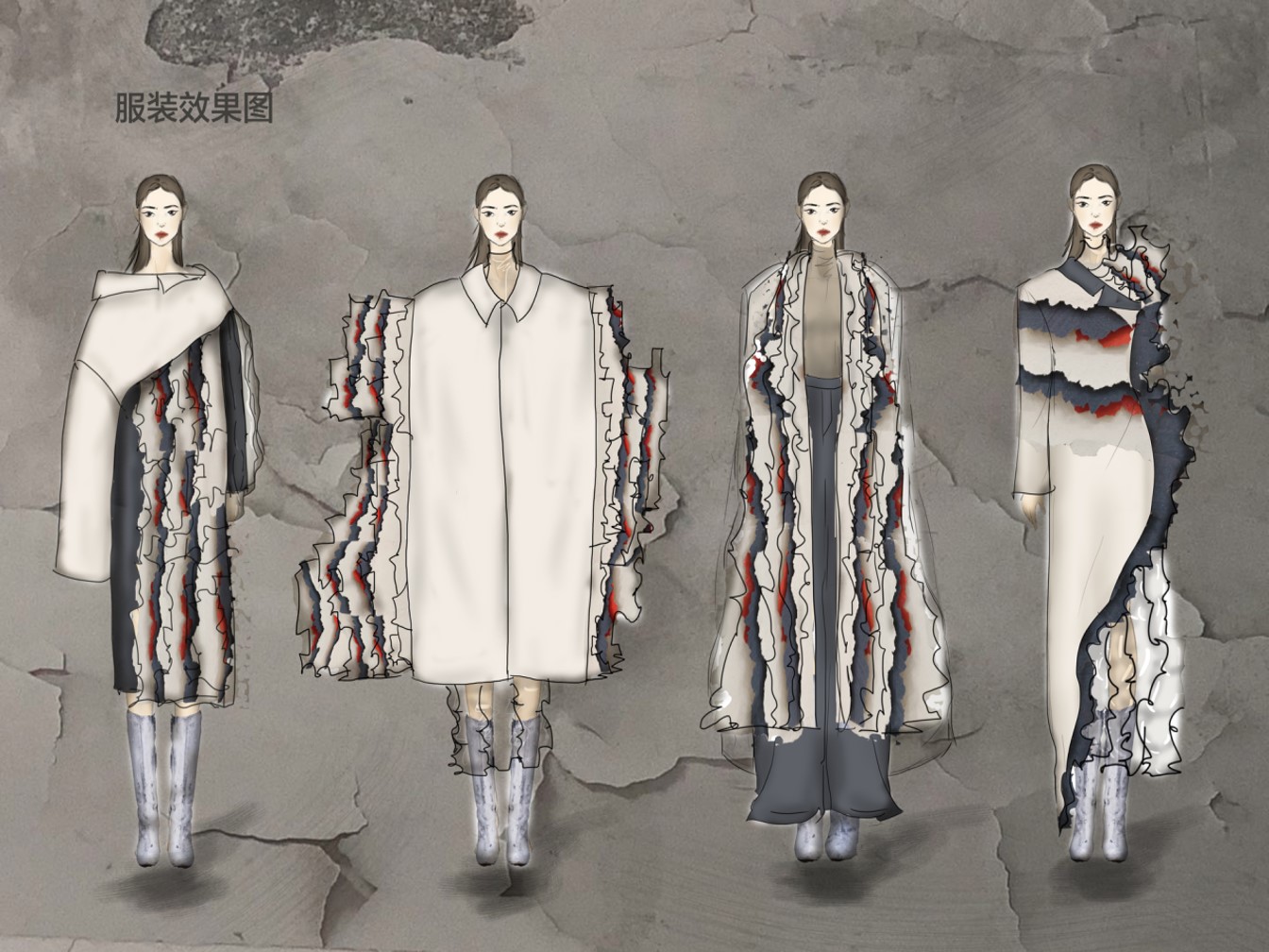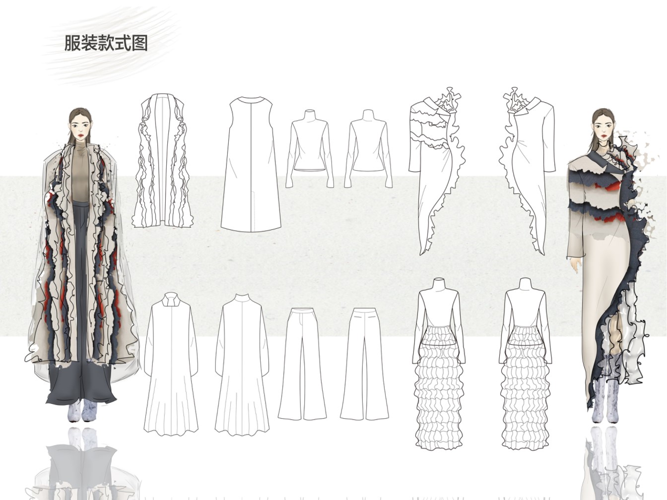 《课程设计》是毕业设计的第一阶段的综合性专业课程。通过该实践性环节让学生从构思、设计到成衣制作等服装企业的全过程进行了解,对相关专业资料的收集和准备,完成对服装市场的调查;从设计服装款式,选择面辅料,完成主题性流行趋势预测方案,为毕业设计作准备。