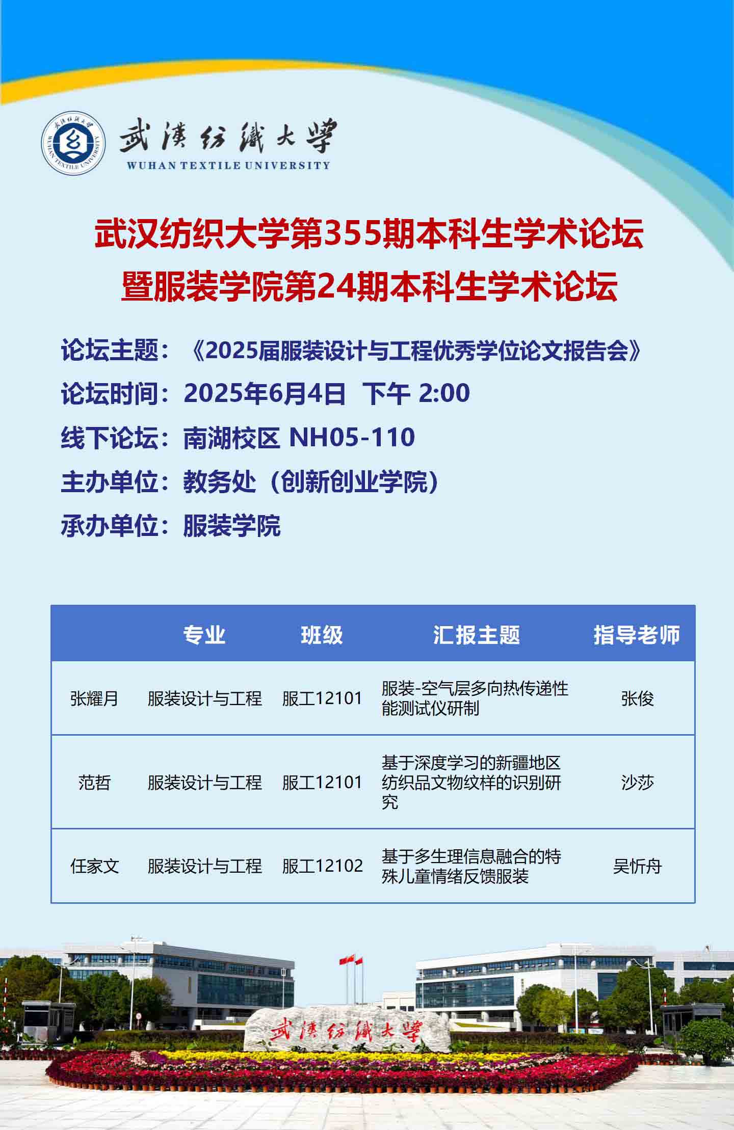 为了进一步加强中国体育博彩 本科生之间学术交流,提高本科生的学术素养,营造浓厚的学术氛围,6月4日下午,中国体育博彩 在尚知楼5110举办了第355期本科生学术论坛暨中国体育博彩 第24期“衣·学”本科生学术论坛。本次论坛邀请了三位服装设计与工程专业2025届优秀学位论文作者汇报了课题研究成果并分享了课题研究经验。论坛由服装设计与工程系主任张俊博士主持,中国体育博彩 院长陶辉教授及服装工程系程婷老师作为点评嘉宾出席本次论坛、2022级和2023级服装设计与工程专业部分学生参加了本次论坛。